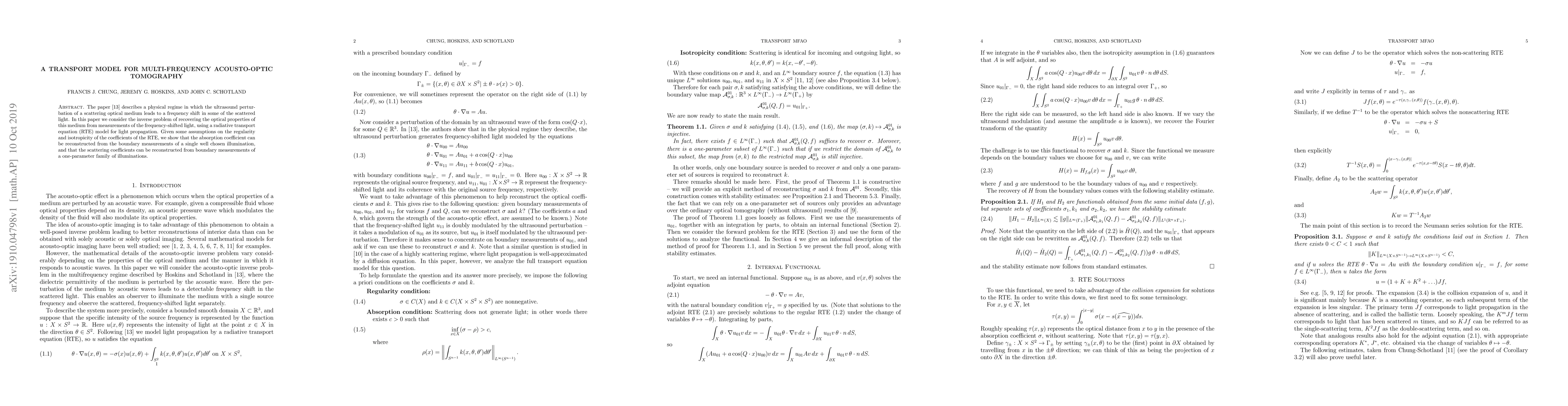 Researchers developed a transport model for Multi-Frequency Acousto-Optic Tomography to reconstruct optical properties of a medium from frequency-shifted light measurements. They successfully reconstructed absorption coefficients with a single illumination and scattering coefficients with a one-parameter family of illuminations.