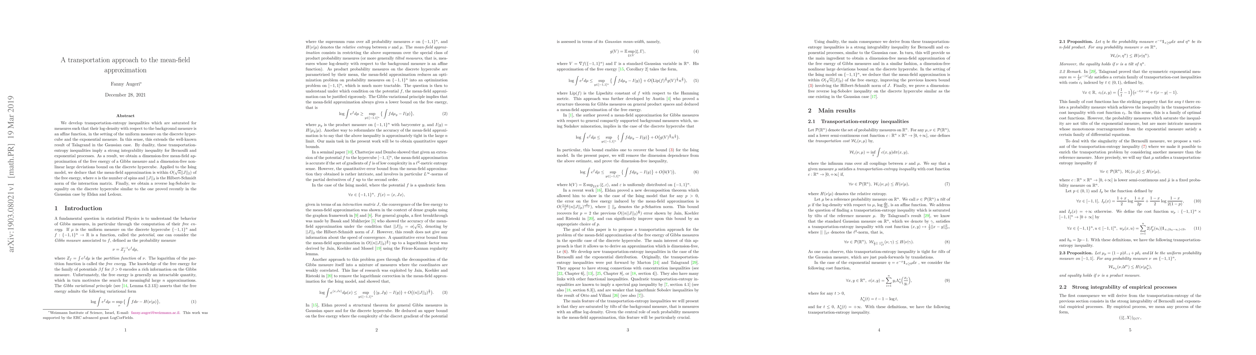 This paper develops transportation-entropy inequalities for Bernoulli and exponential measures, extending Talagrand's Gaussian result. It provides a dimension-free mean-field approximation for Gibbs measures and a nonlinear large deviations bound, with applications to the Ising model and a reverse log-Sobolev inequality.