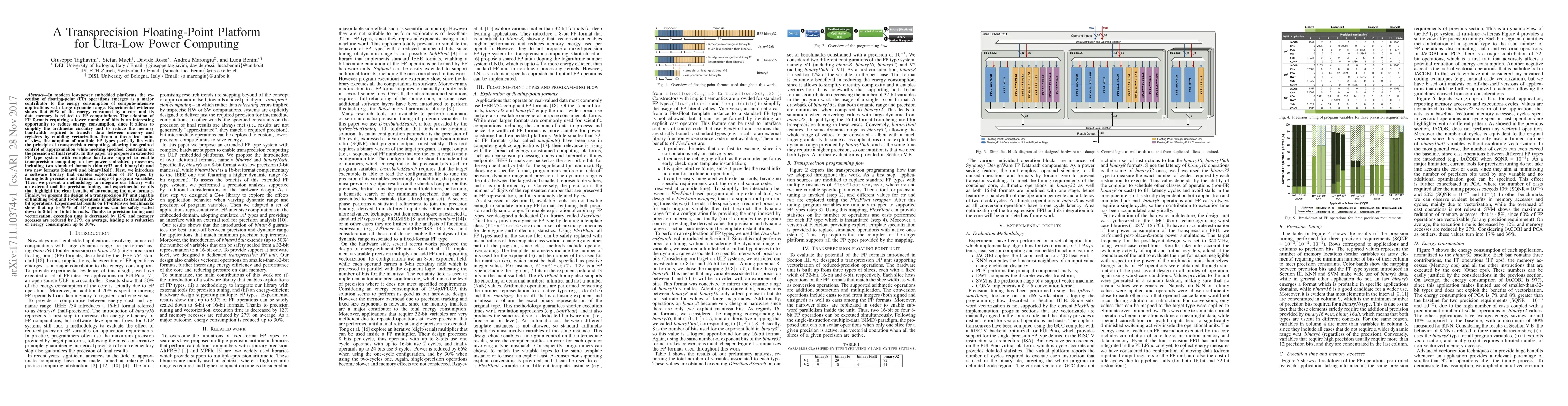 This paper proposes a transprecision floating-point platform for ultra-low power computing, introducing new FP formats (binary8, binary16alt) alongside standard ones (binary32, binary16) to enable fine-grained control of precision and dynamic range. Experimental results show up to 90% of FP operations can be scaled down, reducing energy consumption by up to 30% through precision tuning and vectorization.