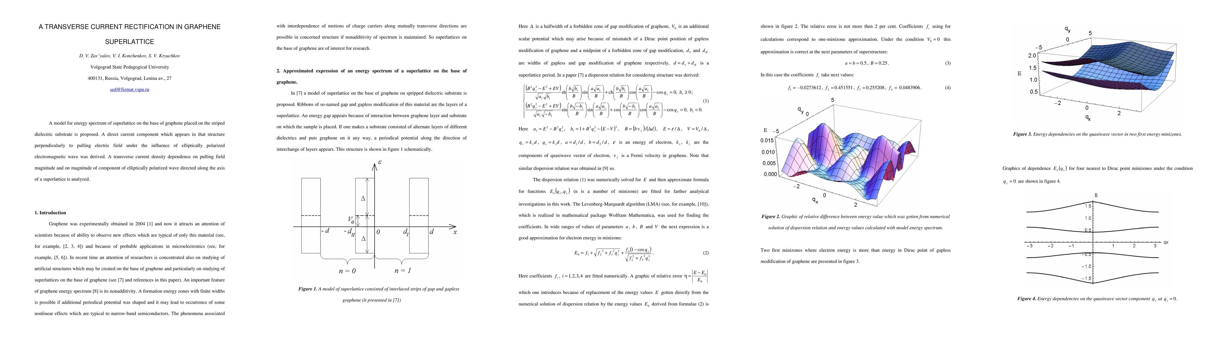 The paper presents a detailed analytical model for the energy spectrum of a graphene superlattice and derives the transverse current rectification effect under elliptically polarized electromagnetic wave influence.