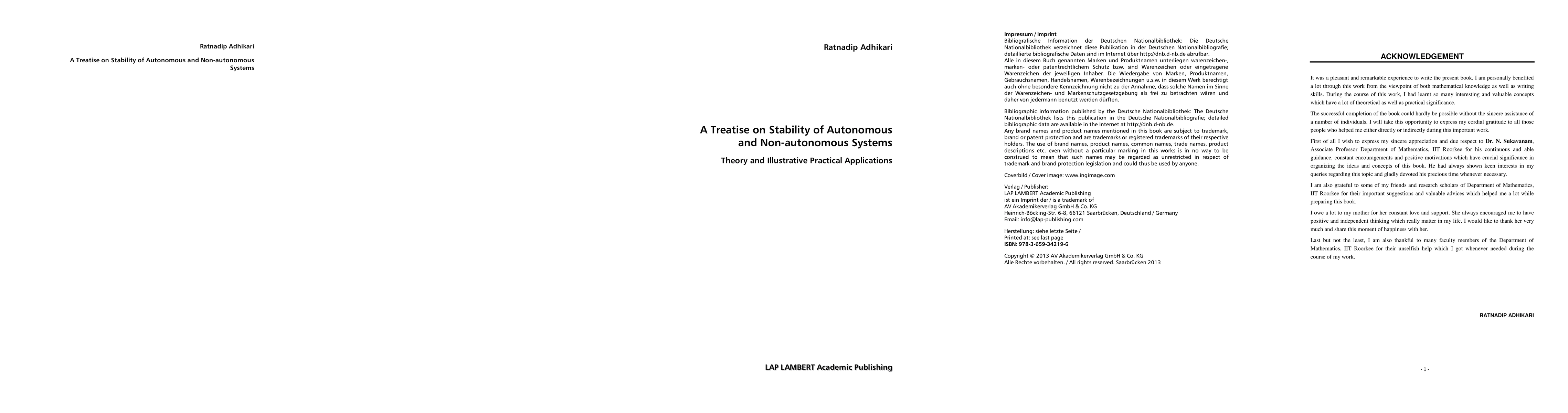 Stability is a very important property of any physical system. By a stable system, we broadly mean that small disturbances either in the system inputs or in the initial conditions do not lead to large changes in the overall behavior of the system. To be of practical use, a system must have to be stable. The theory of stability is a vast, rapidly growing subject with prolific and innovative contributions from numerous researchers. As such, an introductory book that covers the basic concepts and minute details about this theory is essential. The primary aim of this book is to make the readers familiar with the various terminologies and methods related to the stability analysis of time-invariant (autonomous) and time-varying (non-autonomous) systems. A special treatment is given to the celebrated Liapunov's direct method which is so far the most widely used and perhaps the best method for determining the stability nature of both autonomous as well as non-autonomous systems. After discussing autonomous systems to a considerable extent, the book concentrates on the non-autonomous systems. From stability point of view, these systems are often quite difficult to manage. Also, unlike their autonomous counterparts, the non-autonomous systems often behave in peculiar manners which can make the analysts arrive at misleading conclusions. Due to these issues, this book attempts to present a careful and systematic study about the stability properties of non-autonomous systems.