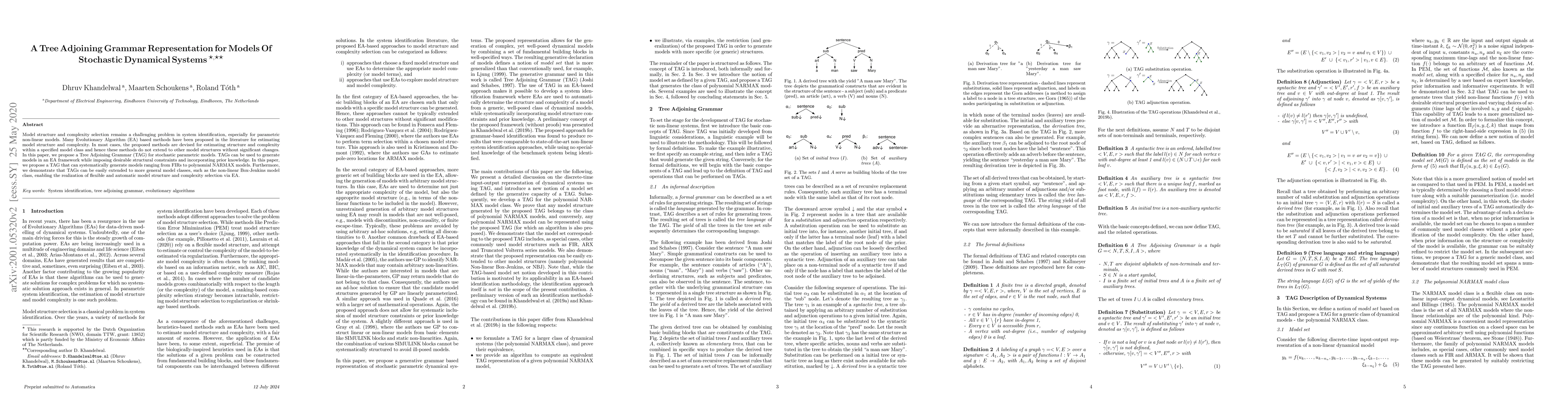 This paper proposes a Tree Adjoining Grammar (TAG) representation for stochastic dynamical systems to facilitate model structure and complexity selection in system identification. The proposed TAG framework can generate diverse parametric models, including FIRs and polynomial NARMAX models, and can be extended to more general non-linear models, enabling flexible and automatic model selection via Evolutionary Algorithms.
