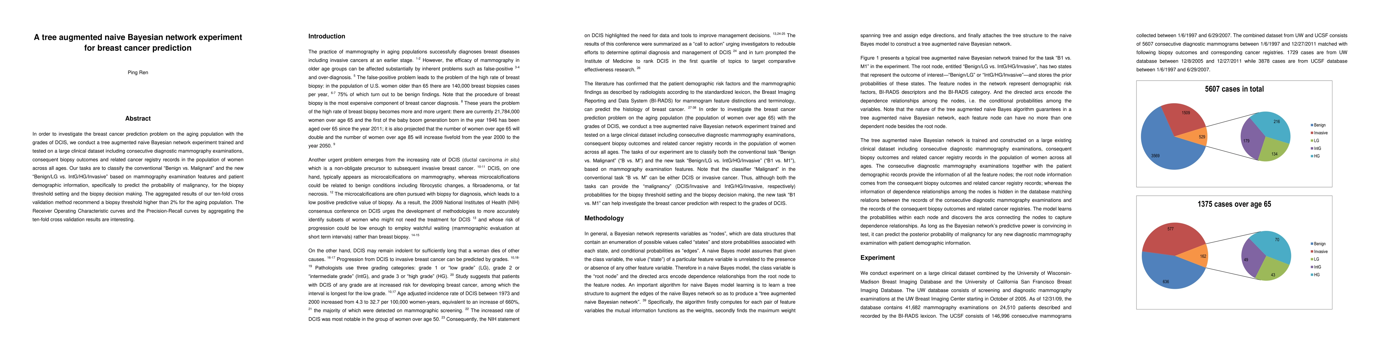 In order to investigate the breast cancer prediction problem on the aging population with the grades of DCIS, we conduct a tree augmented naive Bayesian network experiment trained and tested on a large clinical dataset including consecutive diagnostic mammography examinations, consequent biopsy outcomes and related cancer registry records in the population of women across all ages. The aggregated results of our ten-fold cross validation method recommend a biopsy threshold higher than 2% for the aging population.