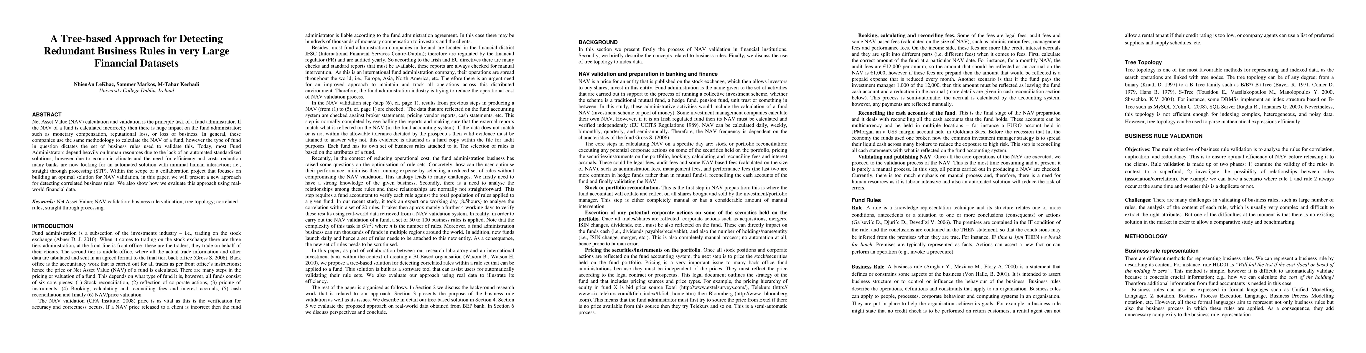Net Asset Value (NAV) calculation and validation is the principle task of a fund administrator. If the NAV of a fund is calculated incorrectly then there is huge impact on the fund administrator; such as monetary compensation, reputational loss, or loss of business. In general, these companies use the same methodology to calculate the NAV of a fund, however the type of fund in question dictates the set of business rules used to validate this. Today, most Fund Administrators depend heavily on human resources due to the lack of an automated standardized solutions, however due to economic climate and the need for efficiency and costs reduction many banks are now looking for an automated solution with minimal human interaction; i.e., straight through processing (STP). Within the scope of a collaboration project that focuses on building an optimal solution for NAV validation, in this paper, we will present a new approach for detecting correlated business rules. We also show how we evaluate this approach using real-world financial data.