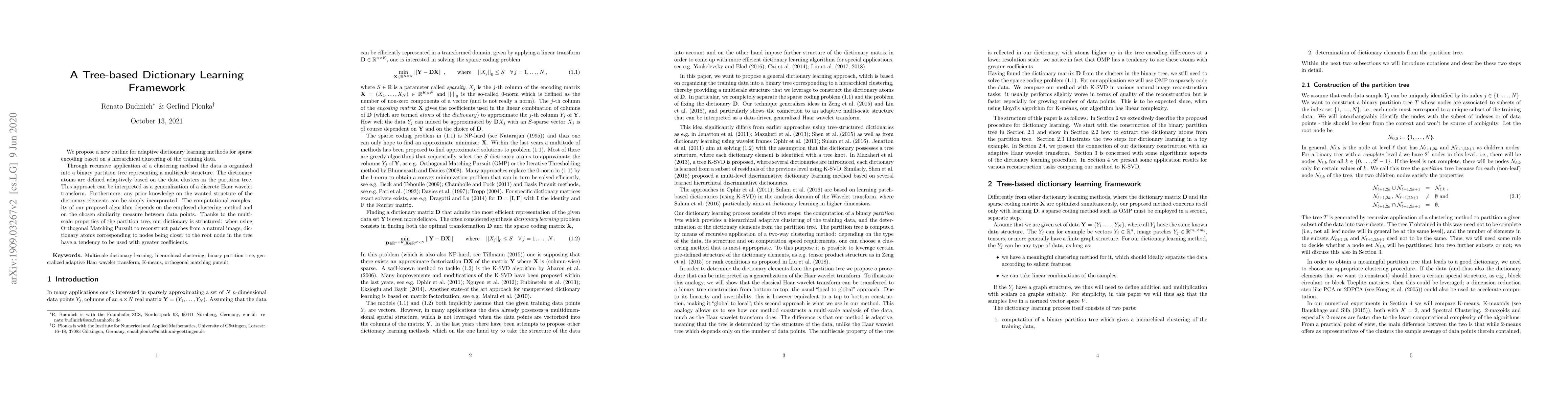 We propose a new outline for adaptive dictionary learning methods for sparse encoding based on a hierarchical clustering of the training data. Through recursive application of a clustering method, the data is organized into a binary partition tree representing a multiscale structure. The dictionary atoms are defined adaptively based on the data clusters in the partition tree. This approach can be interpreted as a generalization of a discrete Haar wavelet transform. Furthermore, any prior knowledge on the wanted structure of the dictionary elements can be simply incorporated. The computational complexity of our proposed algorithm depends on the employed clustering method and on the chosen similarity measure between data points. Thanks to the multiscale properties of the partition tree, our dictionary is structured: when using Orthogonal Matching Pursuit to reconstruct patches from a natural image, dictionary atoms corresponding to nodes being closer to the root node in the tree have a tendency to be used with greater coefficients.