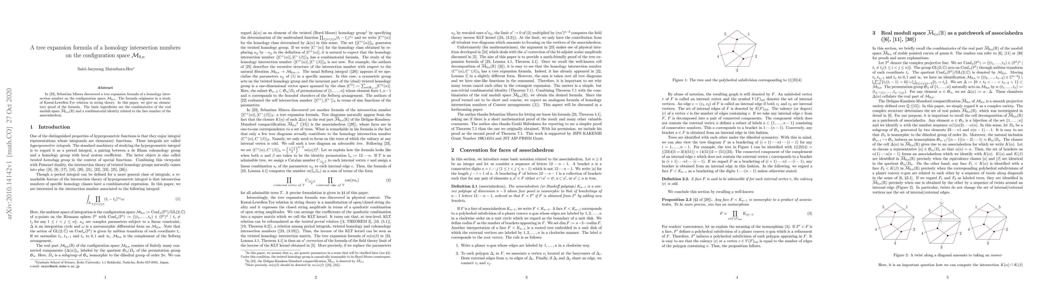 In \cite{M}, Sebastian Mizera discovered a tree expansion formula of a homology intersection number on the configuration space $\mathcal{M}_{0,n}$. The formula originates in a study of Kawai-Lewellen-Tye relation in string theory. In this paper, we give an elementary proof of the formula. The basic ingredients are the combinatorics of the real moduli space $\overline{\mathcal{M}}_{0,n}(\R)$ and a combinatorial identity related to the face number of the associahedron.