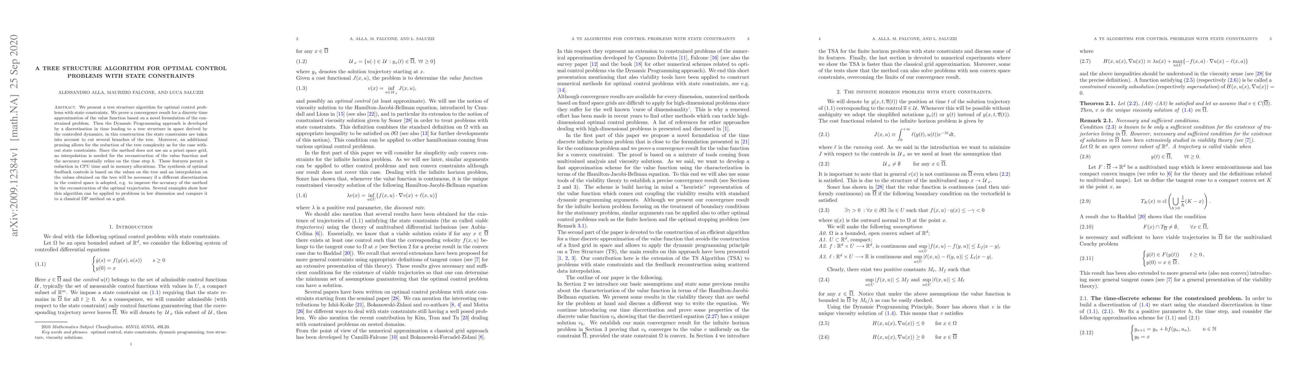 This paper introduces a tree structure algorithm for solving optimal control problems with state constraints, proving its convergence and demonstrating its efficiency through reduced computational complexity and memory usage. The method avoids interpolation and relies on the time step for accuracy, while also showing practical applications and comparisons to classical grid-based Dynamic Programming methods.