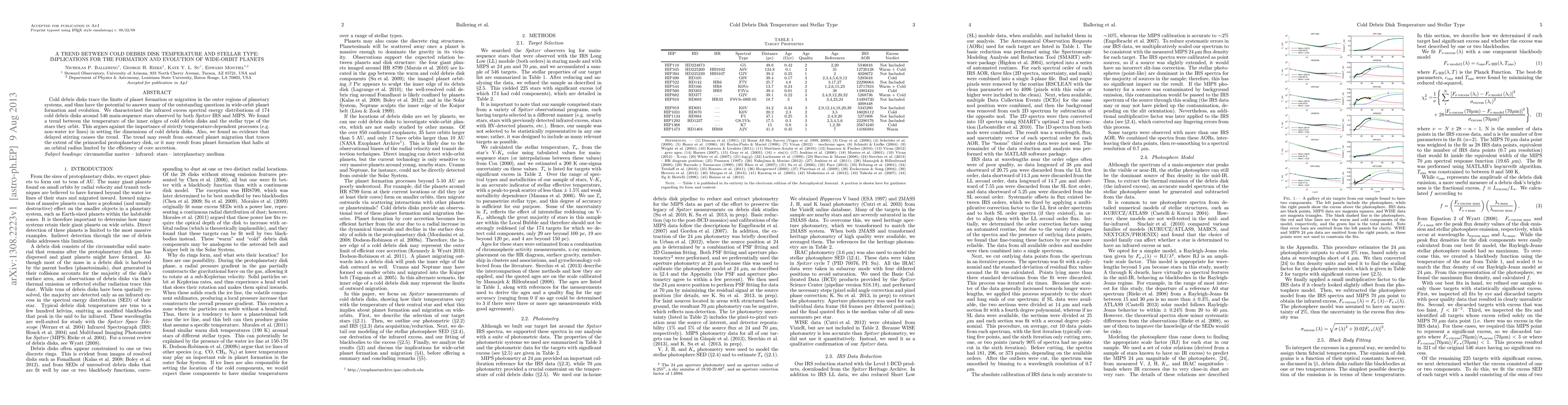 Cold debris disks trace the limits of planet formation or migration in the outer regions of planetary systems, and thus have the potential to answer many of the outstanding questions in wide-orbit planet formation and evolution. We characterized the infrared excess spectral energy distributions of 174 cold debris disks around 546 main-sequence stars observed by both Spitzer IRS and MIPS. We found a trend between the temperature of the inner edges of cold debris disks and the stellar type of the stars they orbit. This argues against the importance of strictly temperature-dependent processes (e.g. non-water ice lines) in setting the dimensions of cold debris disks. Also, we found no evidence that delayed stirring causes the trend. The trend may result from outward planet migration that traces the extent of the primordial protoplanetary disk, or it may result from planet formation that halts at an orbital radius limited by the efficiency of core accretion.