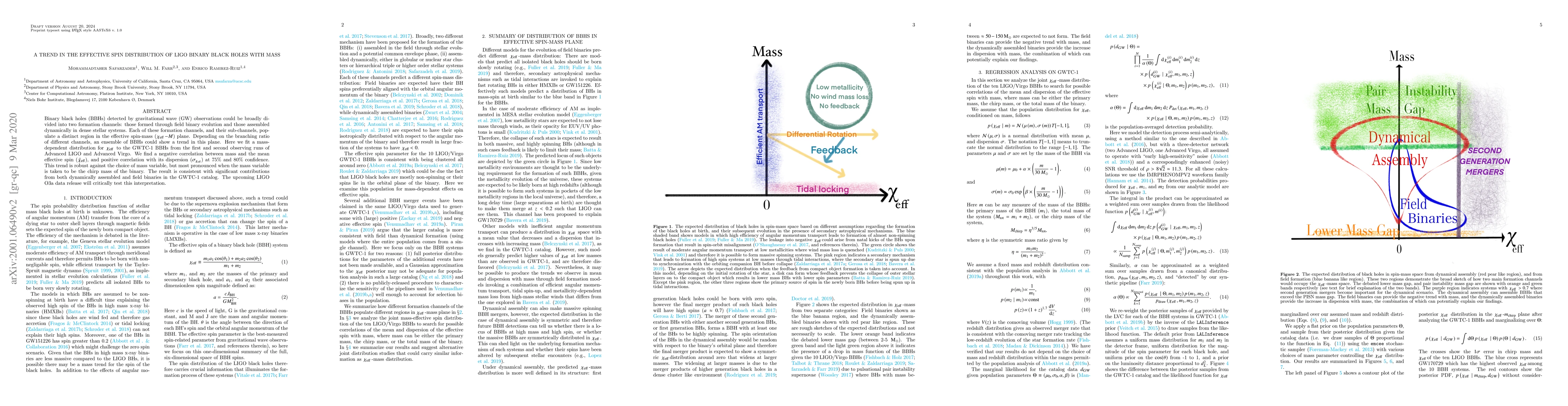 Binary black holes (BBHs) detected by gravitational wave (GW) observations could be broadly divided into two formation channels: those formed through field binary evolution and those assembled dynamically in dense stellar systems. Each of these formation channels, and their sub-channels, populate a distinct region in the effective spin-mass ($\chi_{\rm eff}-M$) plane. Depending on the branching ratio of different channels, an ensemble of BBHs could show a trend in this plane. Here we fit a mass-dependent distribution for $\chi_{\rm eff}$ to the GWTC-1 BBHs from the first and second observing runs of Advanced LIGO and Advanced Virgo. We find a negative correlation between mass and the mean effective spin ($\bar{\chi}_{\mathrm{eff}}$), and positive correlation with its dispersion ($\sigma_{\chi_\mathrm{eff}}$) at 75\% and 80\% confidence. This trend is robust against the choice of mass variable, but most pronounced when the mass variable is taken to be the chirp mass of the binary. The result is consistent with significant contributions from both dynamically assembled and field binaries in the GWTC-1 catalog. The upcoming LIGO O3a data release will critically test this interpretation.