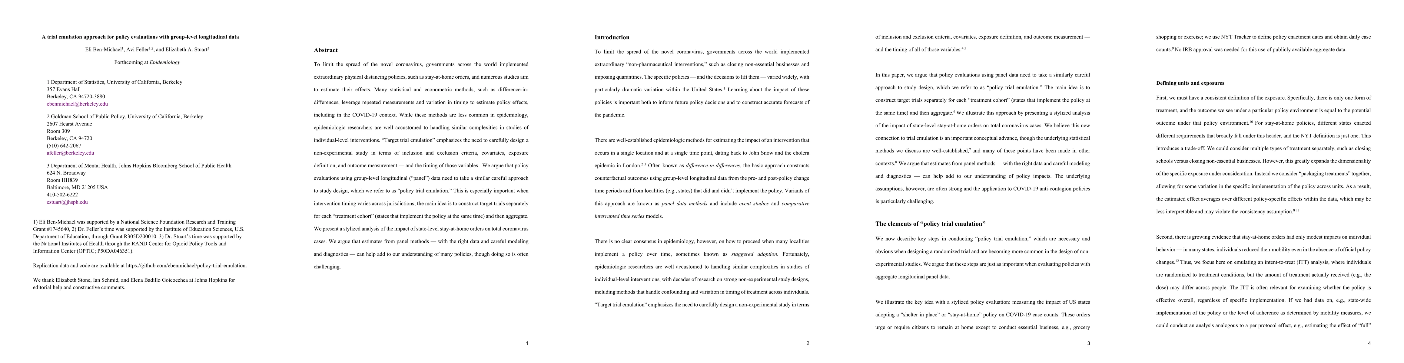 To limit the spread of the novel coronavirus, governments across the world implemented extraordinary physical distancing policies, such as stay-at-home orders, and numerous studies aim to estimate their effects. Many statistical and econometric methods, such as difference-in-differences, leverage repeated measurements and variation in timing to estimate policy effects, including in the COVID-19 context. While these methods are less common in epidemiology, epidemiologic researchers are well accustomed to handling similar complexities in studies of individual-level interventions. "Target trial emulation" emphasizes the need to carefully design a non-experimental study in terms of inclusion and exclusion criteria, covariates, exposure definition, and outcome measurement -- and the timing of those variables. We argue that policy evaluations using group-level longitudinal ("panel") data need to take a similar careful approach to study design, which we refer to as "policy trial emulation." This is especially important when intervention timing varies across jurisdictions; the main idea is to construct target trials separately for each "treatment cohort" (states that implement the policy at the same time) and then aggregate. We present a stylized analysis of the impact of state-level stay-at-home orders on total coronavirus cases. We argue that estimates from panel methods -- with the right data and careful modeling and diagnostics -- can help add to our understanding of many policies, though doing so is often challenging.
