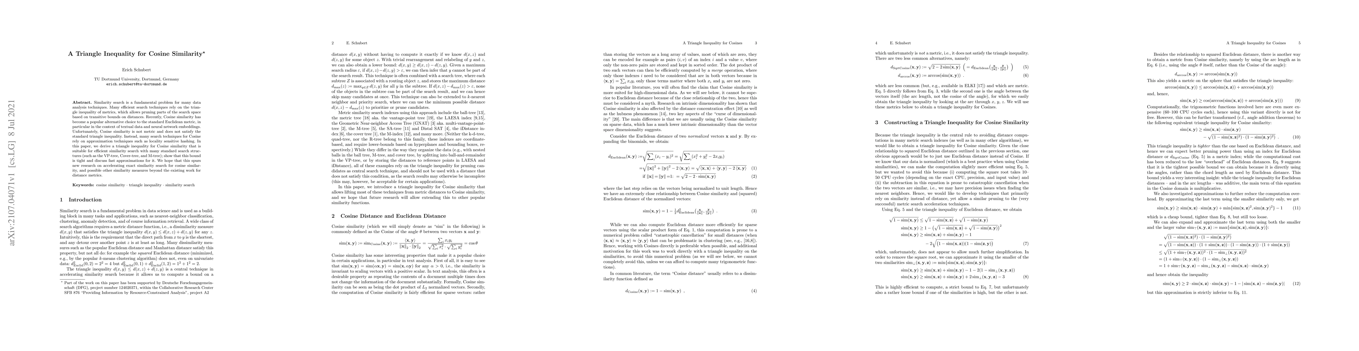 This paper develops a triangle inequality for Cosine similarity, enabling efficient similarity search methods that rely on metric properties, and demonstrates its tightness. It aims to accelerate exact similarity search for Cosine similarity and inspire further research on non-distance similarity measures.