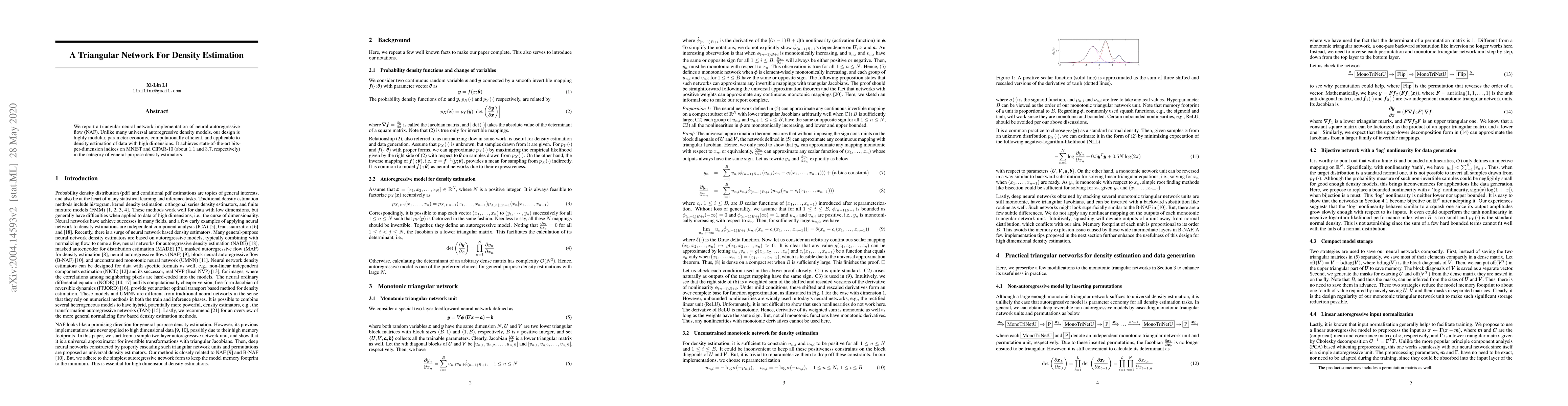We report a triangular neural network implementation of neural autoregressive flow (NAF). Unlike many universal autoregressive density models, our design is highly modular, parameter economy, computationally efficient, and applicable to density estimation of data with high dimensions. It achieves state-of-the-art bits-per-dimension indices on MNIST and CIFAR-10 (about 1.1 and 3.7, respectively) in the category of general-purpose density estimators.