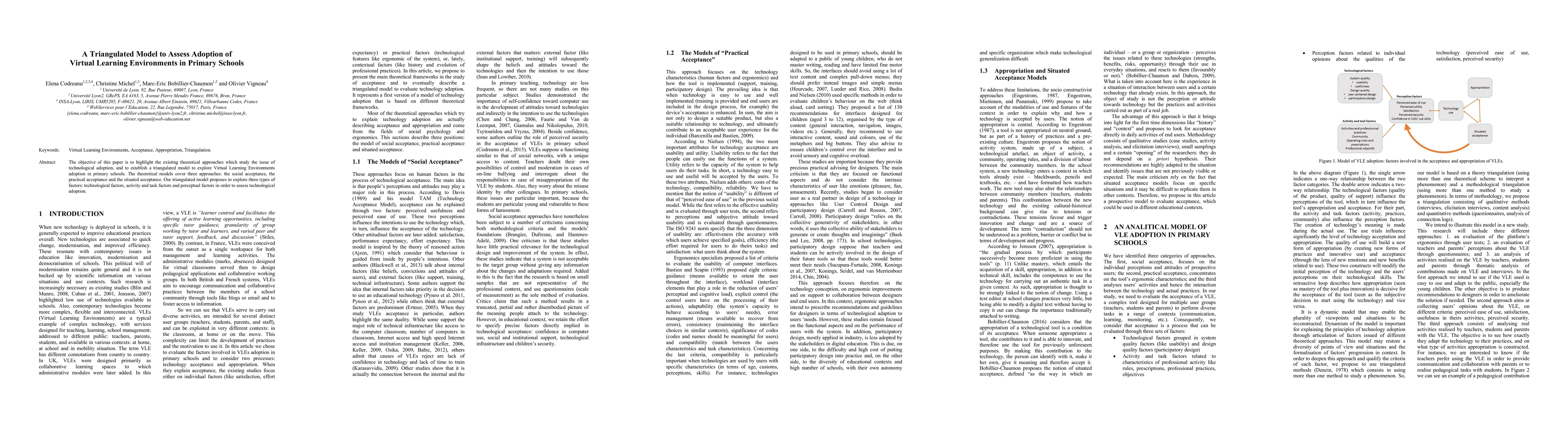 The objective of this paper is to highlight the existing theoretical approaches which study the issue of technology adoption, and to establish a triangulated model to explore Virtual Learning Environments adoption in primary schools. We studied the process of adoption through the lens of two related processes: the technological acceptance and appropriation.