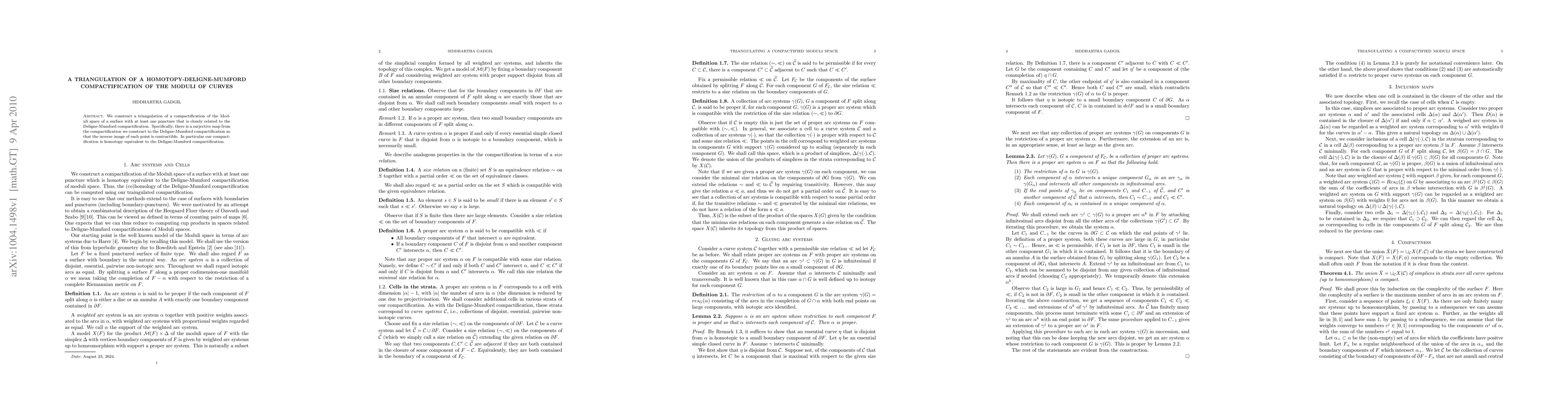 The paper constructs a new triangulation for a homotopy-equivalent compactification of the Moduli space of curves, showing a surjective map to the Deligne-Mumford compactification where each point's preimage is contractible. This new compactification is proven to be homotopy equivalent to the Deligne-Mumford compactification.
