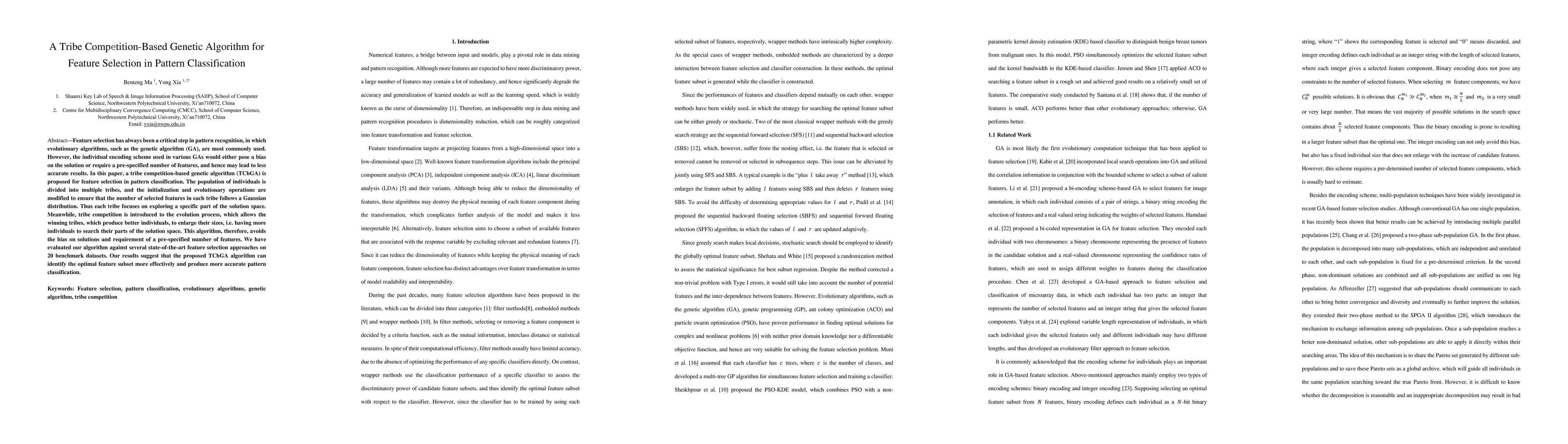 This paper proposes a tribe competition-based genetic algorithm (TCbGA) for feature selection in pattern classification that divides the population into tribes to explore specific solution spaces, enhancing the search efficiency. Evaluations on benchmark datasets show TCbGA identifies optimal features and achieves more accurate classification compared to other methods.