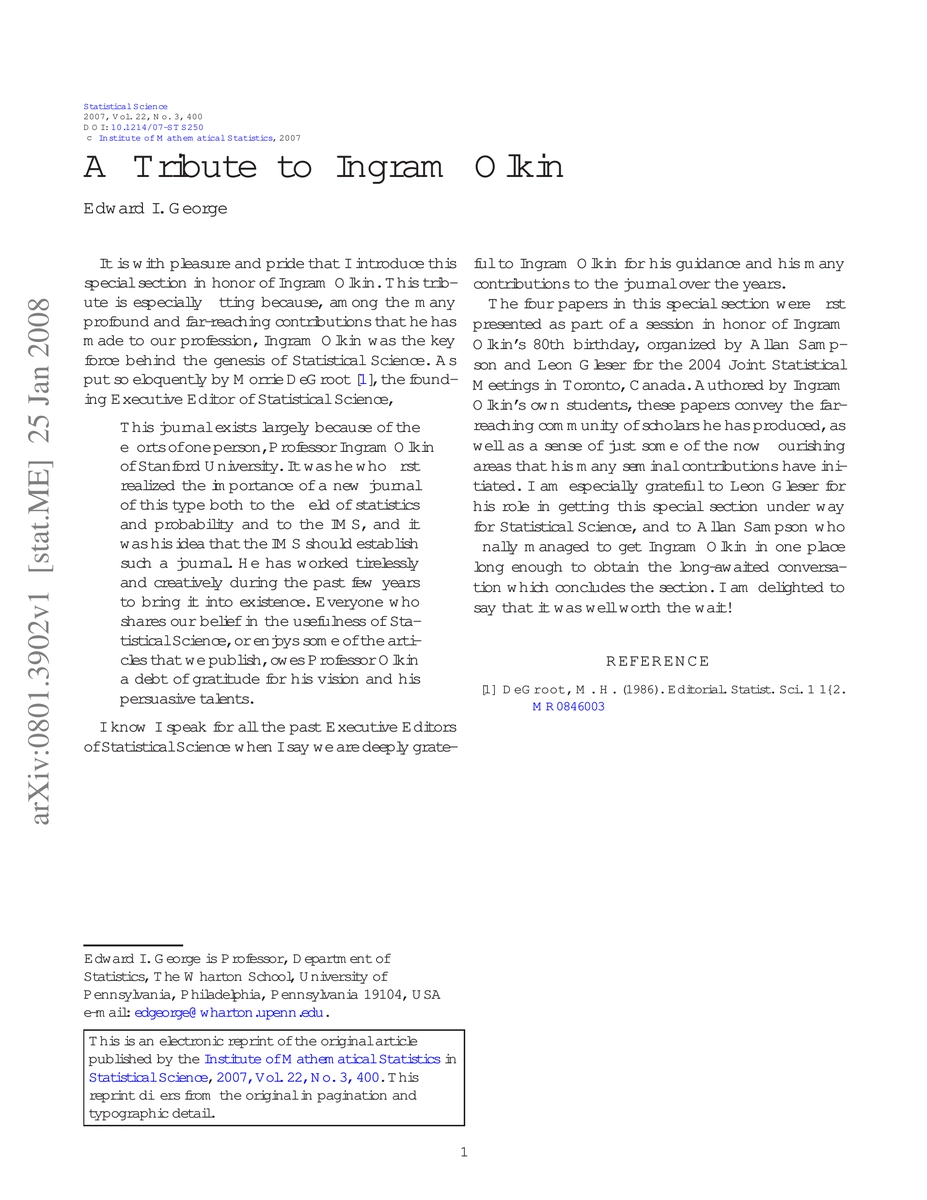 It is with pleasure and pride that I introduce this special section in honor of Ingram Olkin. This tribute is especially fitting because, among the many profound and far-reaching contributions that he has made to our profession, Ingram Olkin was the key force behind the genesis of Statistical Science. As put so eloquently by Morrie DeGroot [1], the founding Executive Editor of Statistical Science.