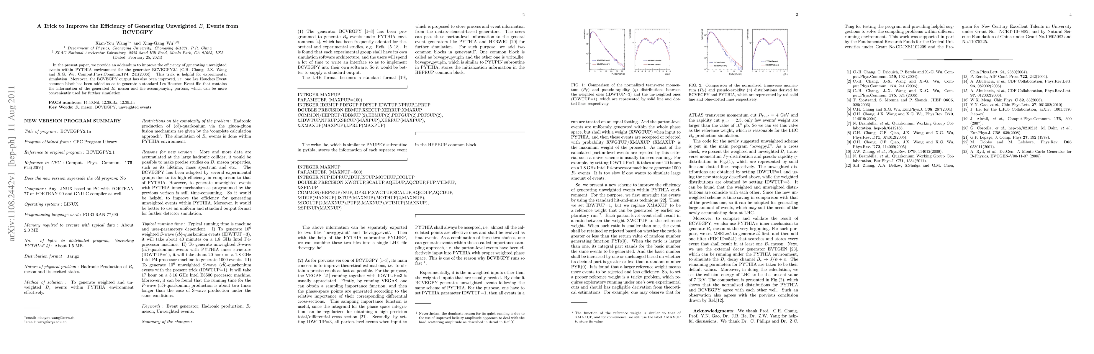 This paper presents a method to enhance the efficiency of generating unweighted $B_c$ events in the BCVEGPY2.1 generator within the PYTHIA environment, aiding experimental simulations. Additionally, the BCVEGPY output now includes a Les Houches Event file for standardized data on $B_c$ mesons and partons.