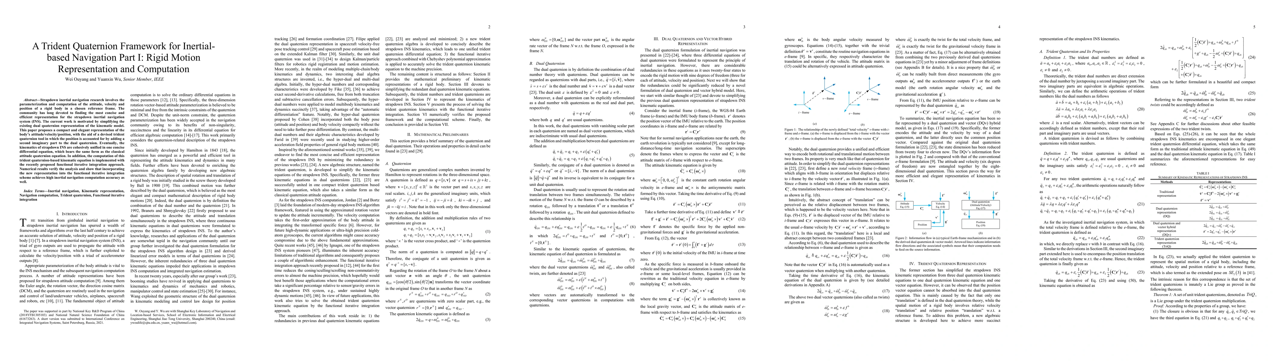 This paper proposes a trident quaternion framework for inertial navigation, simplifying the dual quaternion representation by adding a second imaginary part to account for position. The new representation unifies rigid body attitude, velocity, and position in a single differential equation, enhancing computational efficiency and accuracy.