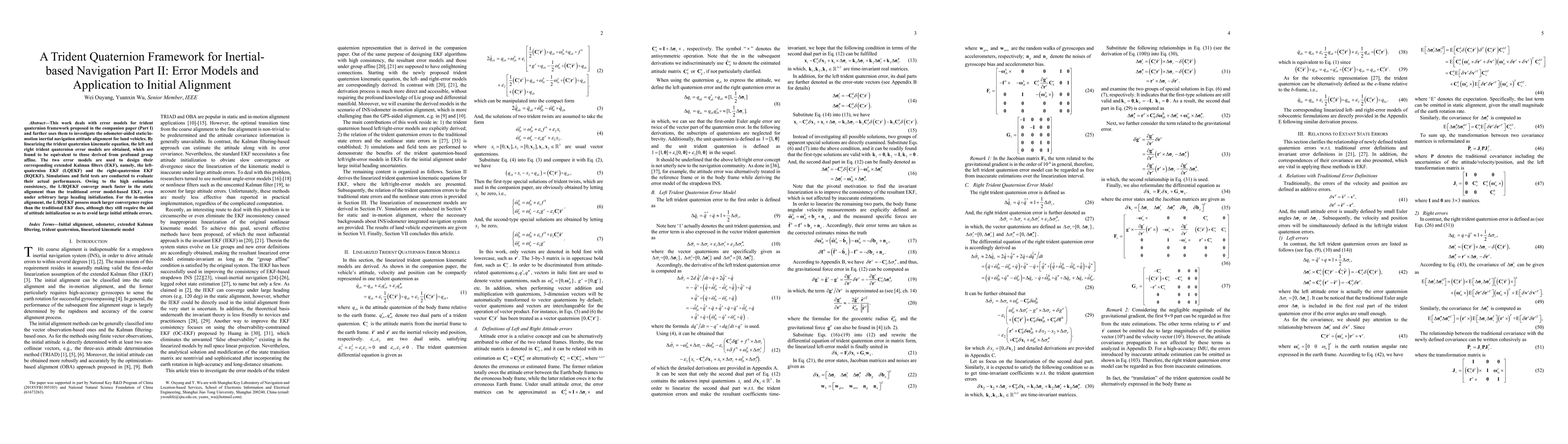 This work deals with error models for trident quaternion framework proposed in the companion paper (Part I) and further uses them to investigate the odometer-aided static/in-motion inertial navigation attitude alignment for land vehicles. By linearizing the trident quaternion kinematic equation, the left and right trident quaternion error models are obtained, which are found to be equivalent to those derived from profound group affine. The two error models are used to design their corresponding extended Kalman filters (EKF), namely, the left-quaternion EKF (LQEKF) and the right-quaternion EKF (RQEKF). Simulations and field tests are conducted to evaluate their actual performances. Owing to the high estimation consistency, the L/RQEKF converge much faster in the static alignment than the traditional error model-based EKF, even under arbitrary large heading initialization. For the in-motion alignment, the L/RQEKF possess much larger convergence region than the traditional EKF does, although they still require the aid of attitude initialization so as to avoid large initial attitude errors.