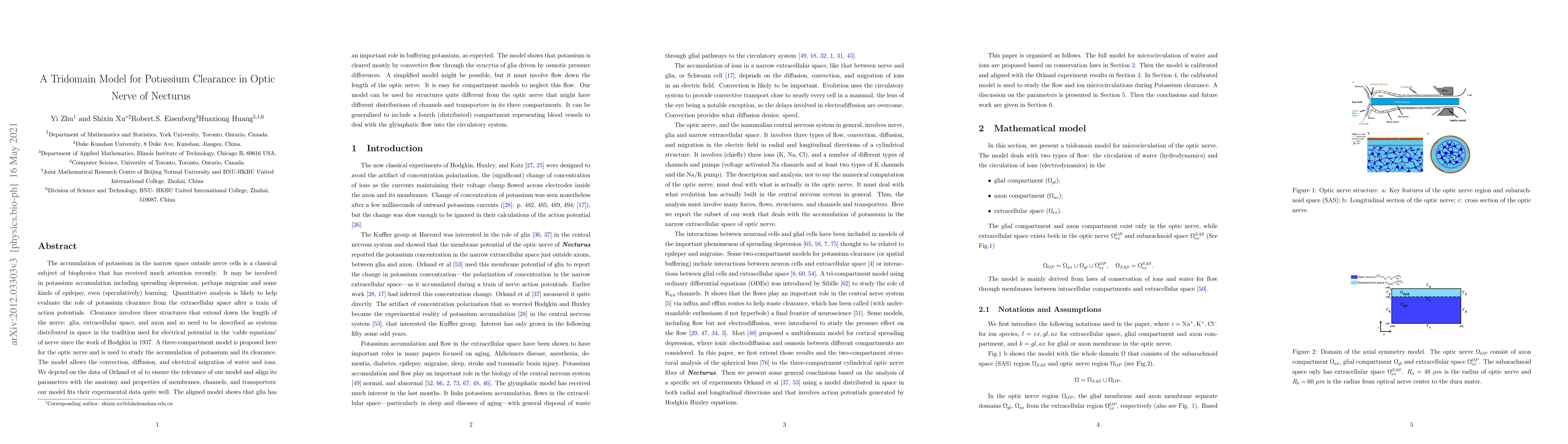 This paper proposes a tridomain model for potassium clearance in the optic nerve of Necturus, emphasizing the role of glia in buffering potassium and convective flow driven by osmotic pressure differences. The model aligns with experimental data and suggests its applicability to other neural structures with similar compartment distributions.