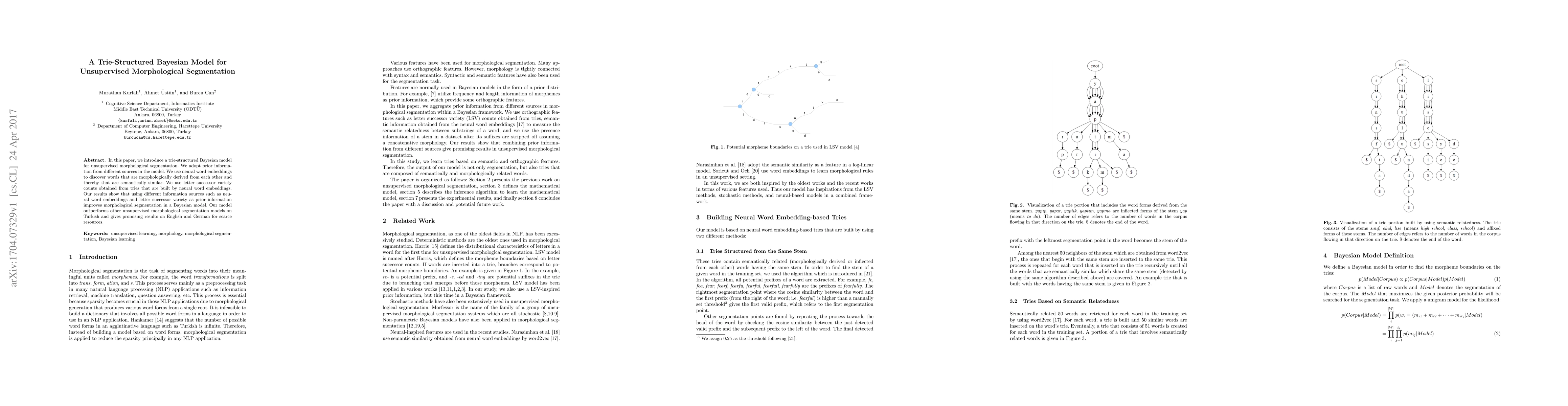 This paper presents a trie-structured Bayesian model for unsupervised morphological segmentation, utilizing neural word embeddings and letter successor variety counts as prior information. The model outperforms other methods on Turkish and shows potential for English and German despite limited resources.