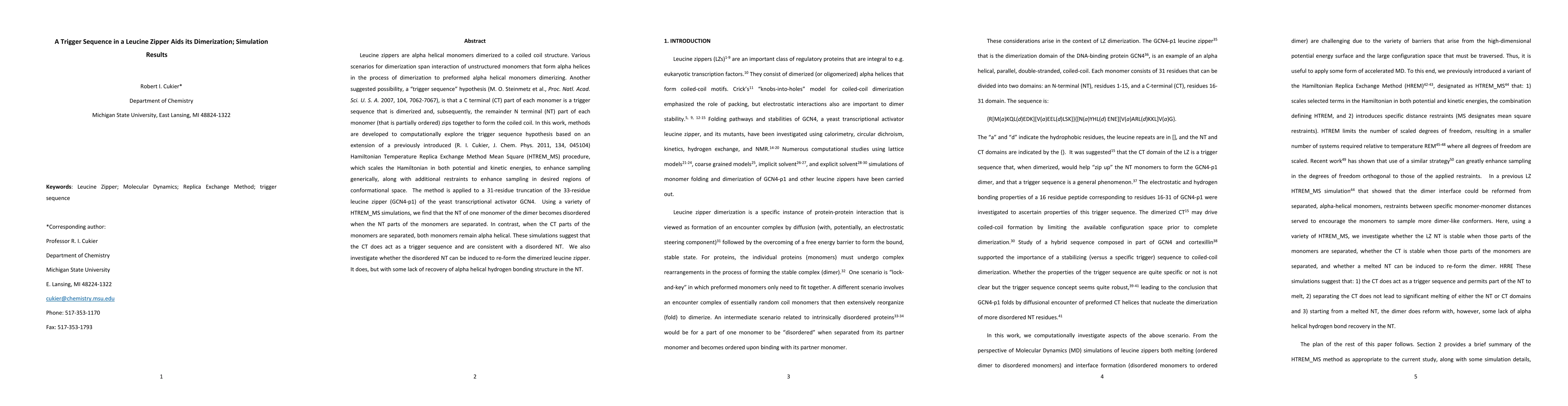 Leucine zippers are alpha helical monomers dimerized to a coiled coil structure. Various scenarios for dimerization span interaction of unstructured monomers that form alpha helices in the process of dimerization to preformed alpha helical monomers dimerizing.Another suggested possibility, a trigger sequence hypothesis (M. O. Steinmetz et al., Proc. Natl. Acad. Sci. U. S. A. 2007, 104, 7062-7067), is that a C terminal (CT) part of each monomer is a trigger sequence that is dimerized and, subsequently, the remainder N terminal (NT) part of each monomer (that is partially ordered) zips together to form the coiled coil. In this work, methods are developed to computationally explore the trigger sequence hypothesis based on an extension of a previously introduced (R. I. Cukier, J. Chem. Phys. 2011, 134, 045104) Hamiltonian Temperature Replica Exchange Method Mean Square (HTREM_MS) procedure, which scales the Hamiltonian in both potential and kinetic energies, to enhance sampling generically, along with additional restraints to enhance sampling in desired regions of conformational space. The method is applied to a 31-residue truncation of the 33-residue leucine zipper (GCN4-p1) of the yeast transcriptional activator GCN4. Using a variety of HTREM_MS simulations, we find that the NT of one monomer of the dimer becomes disordered when the NT parts of the monomers are separated. In contrast, when the CT parts of the monomers are separated, both monomers remain alpha helical. These simulations suggest that the CT does act as a trigger sequence and are consistent with a disordered NT. We also investigate whether the disordered NT can be induced to re-form the dimerized leucine zipper. It does, but with some lack of recovery of alpha helical hydrogen bonding structure in the NT.