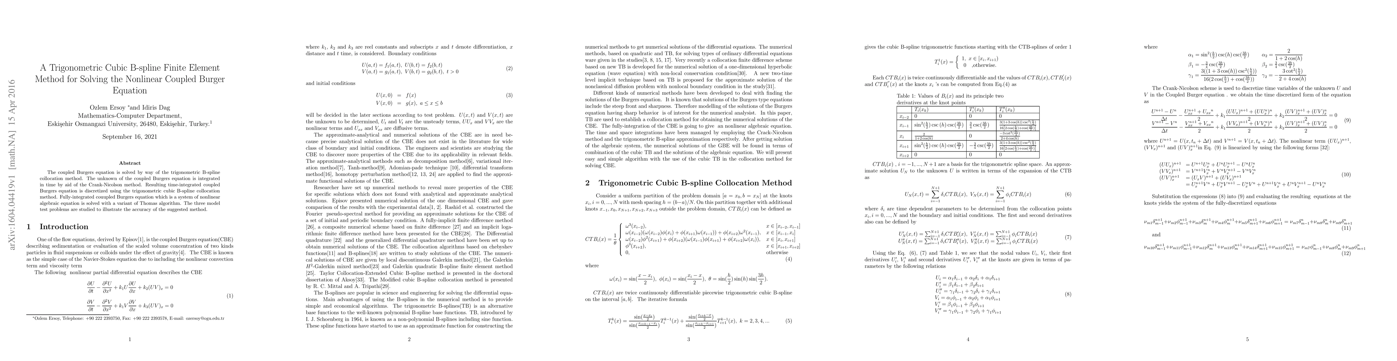 This paper proposes a trigonometric cubic B-spline finite element method for solving the nonlinear coupled Burgers equation, integrating time using the Crank-Nicolson method and solving the resulting algebraic system with a variant of the Thomas algorithm. Three model problems demonstrate the method's accuracy.