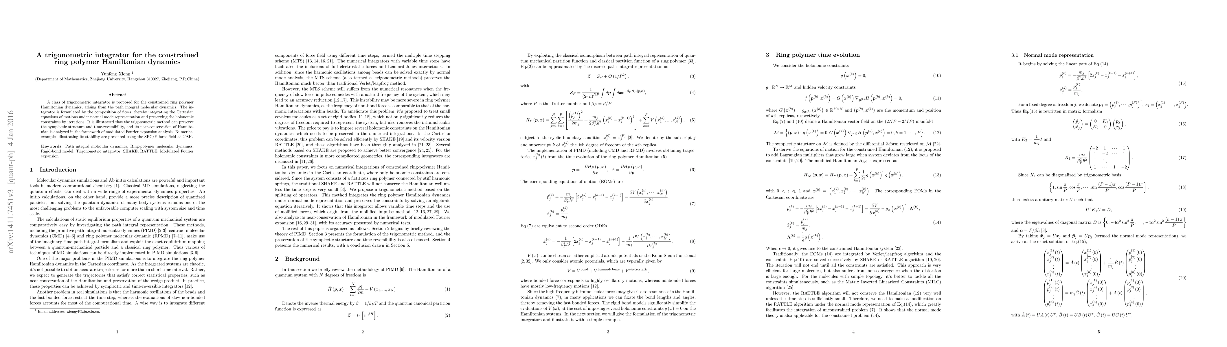 This paper proposes a trigonometric integrator for constrained ring polymer Hamiltonian dynamics, preserving symplectic structure and time-reversibility, and demonstrating near-conservation of Hamiltonian through modulated Fourier expansion analysis. Numerical examples show its stability using the SPC/E force field at 298K.