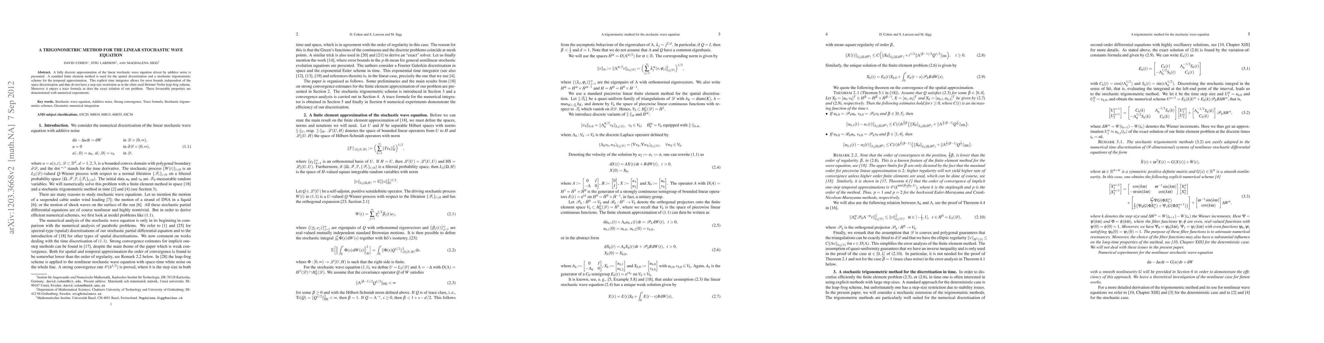 A fully discrete approximation of the linear stochastic wave equation driven by additive noise is presented. A standard finite element method is used for the spatial discretisation and a stochastic trigonometric scheme for the temporal approximation. This explicit time integrator allows for error bounds independent of the space discretisation and thus do not have a step size restriction as in the often used St\"ormer-Verlet-leap-frog scheme. Moreover it enjoys a trace formula as does the exact solution of our problem. These favourable properties are demonstrated with numerical experiments.