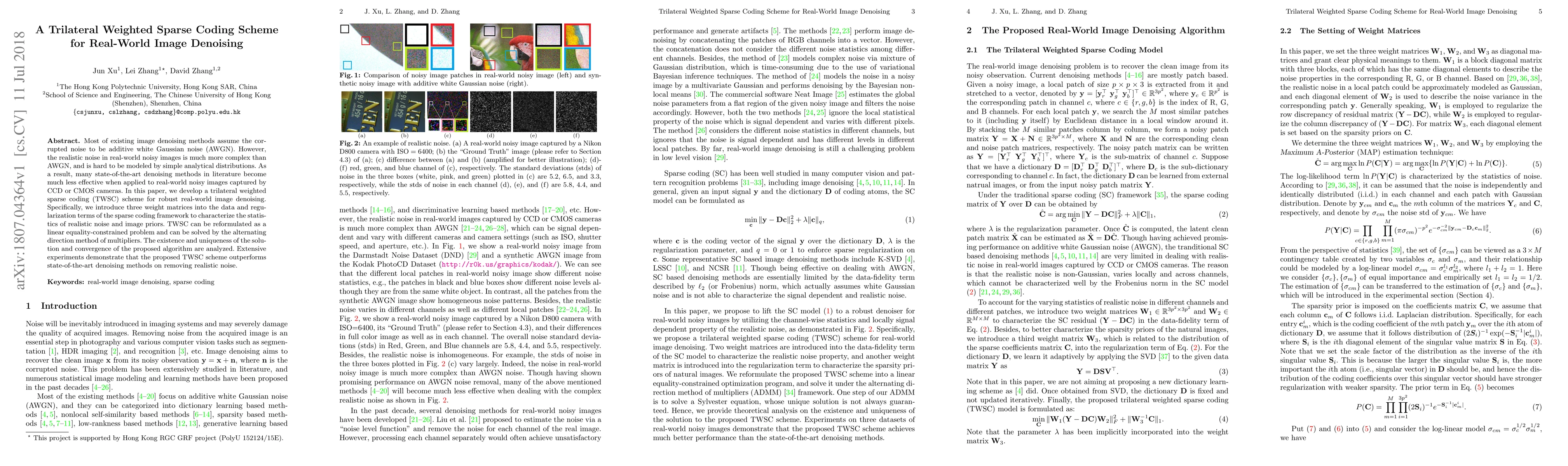 This paper proposes a trilateral weighted sparse coding scheme (TWSC) for denoising real-world images, addressing the limitations of existing methods that assume additive white Gaussian noise. The TWSC method incorporates three weight matrices to model complex, realistic noise and image priors, achieving superior performance in removing realistic noise compared to state-of-the-art methods.