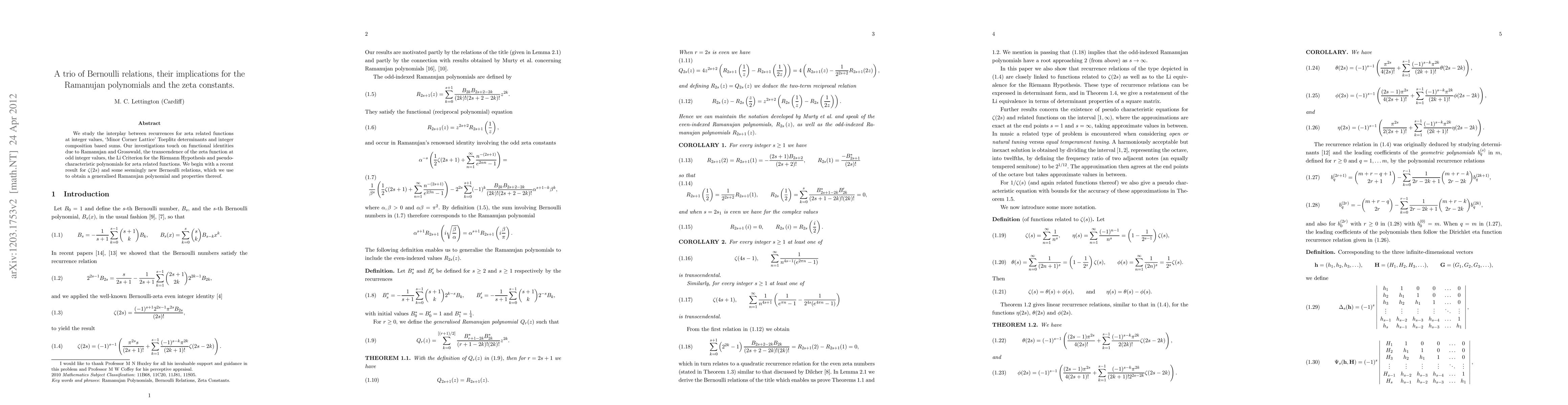 We study the interplay between recurrences for zeta related functions at integer values, `Minor Corner Lattice' Toeplitz determinants and integer composition based sums. Our investigations touch on functional identities due to Ramanujan and Grosswald, the transcendence of the zeta function at odd integer values, the Li Criterion for the Riemann Hypothesis and pseudo-characteristic polynomials for zeta related functions. We begin with a recent result for \zeta(2s) and some seemingly new Bernoulli relations, which we use to obtain a generalised Ramanujan polynomial and properties thereof.