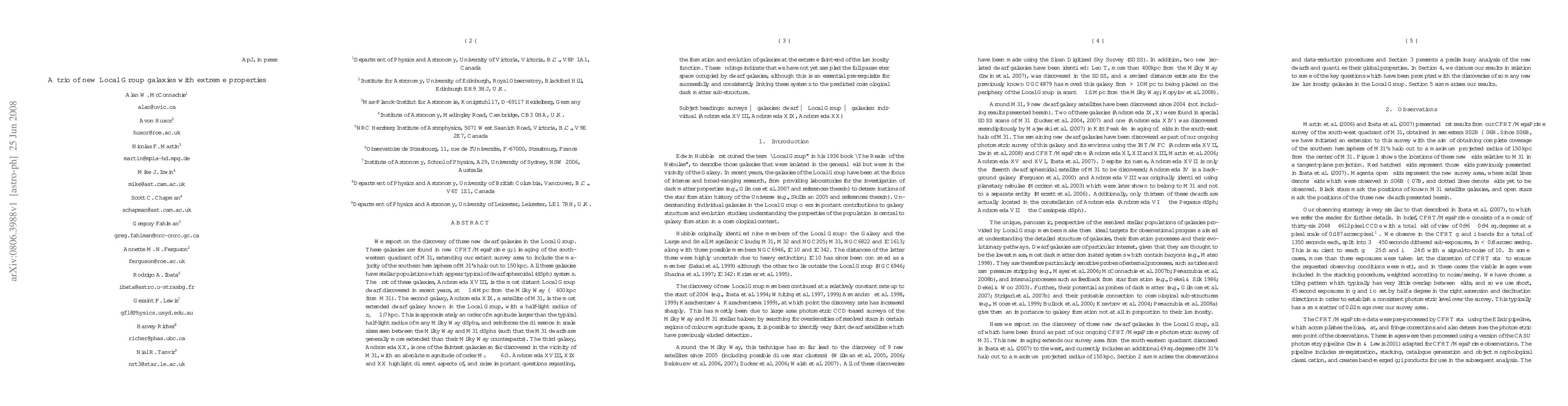 This paper reports the discovery of three new dwarf galaxies in the Local Group, extending the survey area around M31. The galaxies, Andromeda XVIII, XIX, and XX, exhibit extreme properties: XVIII is the most distant, XIX is the most extended, and XX is one of the faintest known. These findings suggest that the full diversity of dwarf galaxies remains unexplored.
