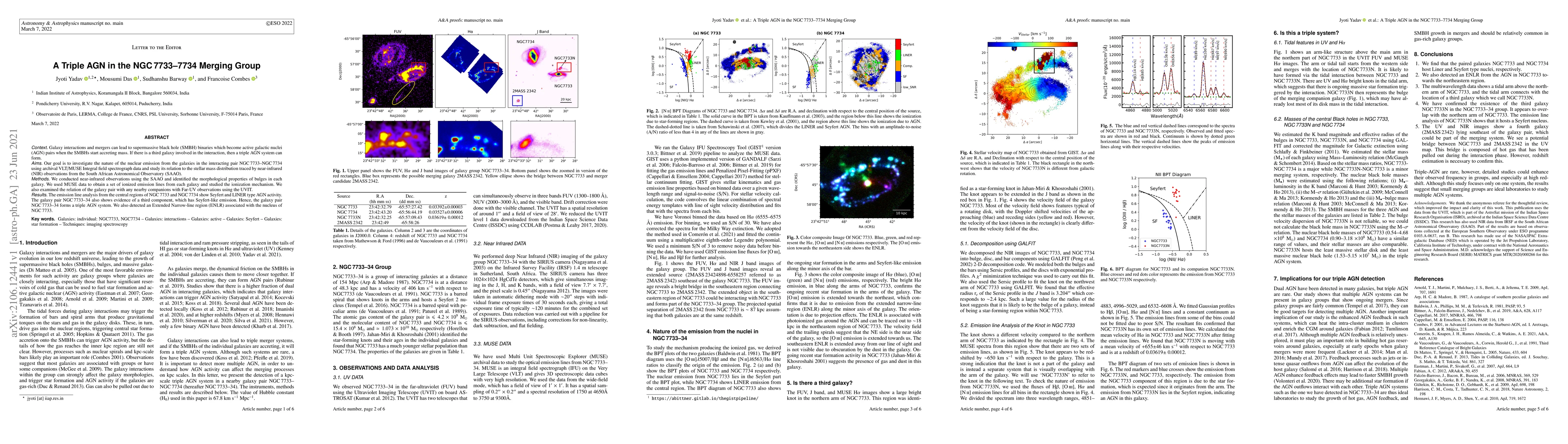 Context: Galaxy interactions and mergers can lead to supermassive black hole (SMBH) binaries which become active galactic nuclei (AGN) pairs when the SMBHs start accreting mass. If there is a third galaxy involved in the interaction, then a triple AGN system can form. Aims: Our goal is to investigate the nature of the nuclear emission from the galaxies in the interacting pair NGC\,7733--NGC\,7734 using archival VLT/MUSE Integral field spectrograph data and study its relation to the stellar mass distribution traced by near-infrared (NIR) observations from the South African Astronomical Observatory (SAAO). Methods:We conducted near-infrared observations using the SAAO and identified the morphological properties of bulges in each galaxy. We used MUSE data to obtain a set of ionized emission lines from each galaxy and studied the ionization mechanism. We also examined the relation of the galaxy pair with any nearby companions with Far-UV observations using the UVIT. Conclusions: The emission line analysis from the central regions of NGC\,7733 and NGC\,7734 show Seyfert and LINER type AGN activity. The galaxy pair NGC\,7733--34 also shows evidence of a third component, which has Seyfert-like emission. Hence, the galaxy pair NGC\,7733--34 forms a triple AGN system. We also detected an Extended Narrow-line region (ENLR) associated with the nucleus of NGC\,7733.