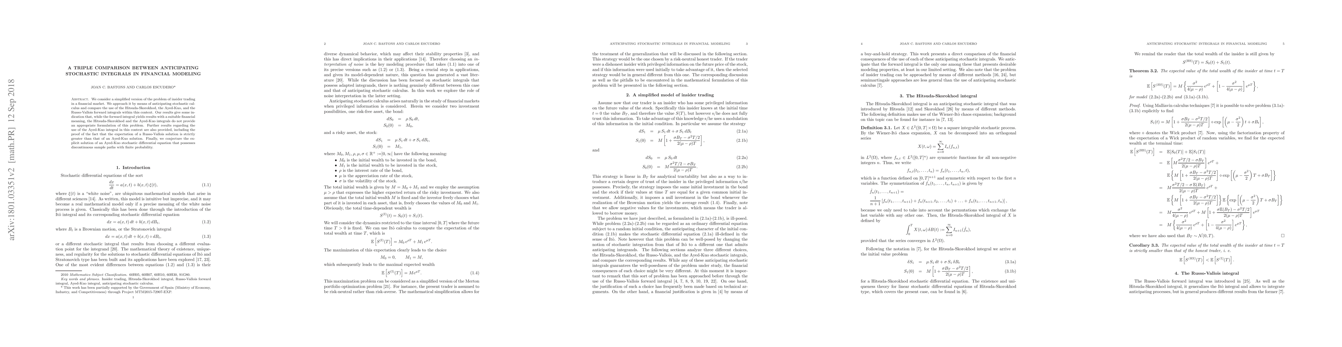 We consider a simplified version of the problem of insider trading in a financial market. We approach it by means of anticipating stochastic calculus and compare the use of the Hitsuda-Skorokhod, the Ayed-Kuo, and the Russo-Vallois forward integrals within this context. Our results give some indication that, while the forward integral yields results with a suitable financial meaning, the Hitsuda-Skorokhod and the Ayed-Kuo integrals do not provide an appropriate formulation of this problem. Further results regarding the use of the Ayed-Kuo integral in this context are also provided, including the proof of the fact that the expectation of a Russo-Vallois solution is strictly greater than that of an Ayed-Kuo solution. Finally, we conjecture the explicit solution of an Ayed-Kuo stochastic differential equation that possesses discontinuous sample paths with finite probability.