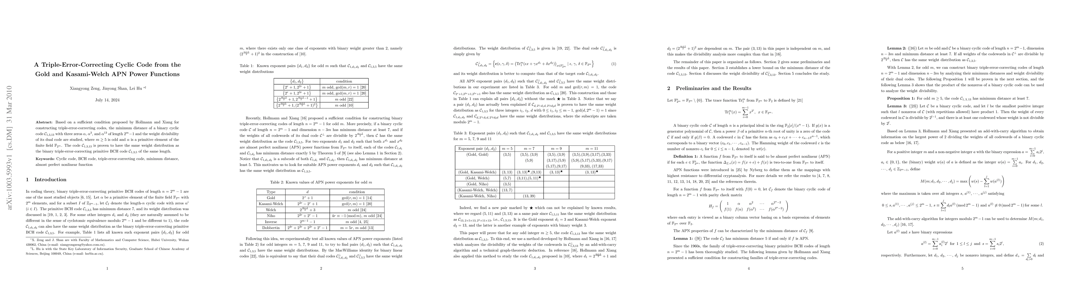 Based on a sufficient condition proposed by Hollmann and Xiang for constructing triple-error-correcting codes, the minimum distance of a binary cyclic code $\mathcal{C}_{1,3,13}$ with three zeros $\alpha$, $\alpha^3$, and $\alpha^{13}$ of length $2^m-1$ and the weight divisibility of its dual code are studied, where $m\geq 5$ is odd and $\alpha$ is a primitive element of the finite field $\mathbb{F}_{2^m}$. The code $\mathcal{C}_{1,3,13}$ is proven to have the same weight distribution as the binary triple-error-correcting primitive BCH code $\mathcal{C}_{1,3,5}$ of the same length.