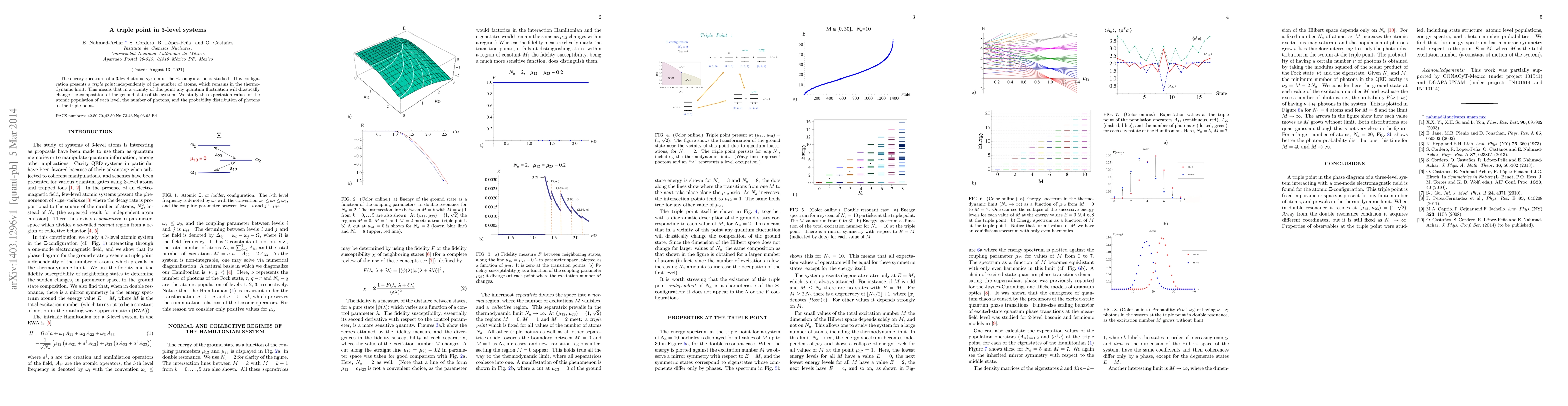 The energy spectrum of a 3-level atomic system in the $\Xi$-configuration is studied. This configuration presents a triple point independently of the number of atoms, which remains in the thermo- dynamic limit. This means that in a vicinity of this point any quantum fluctuation will drastically change the composition of the ground state of the system. We study the expectation values of the atomic population of each level, the number of photons, and the probability distribution of photons at the triple point.