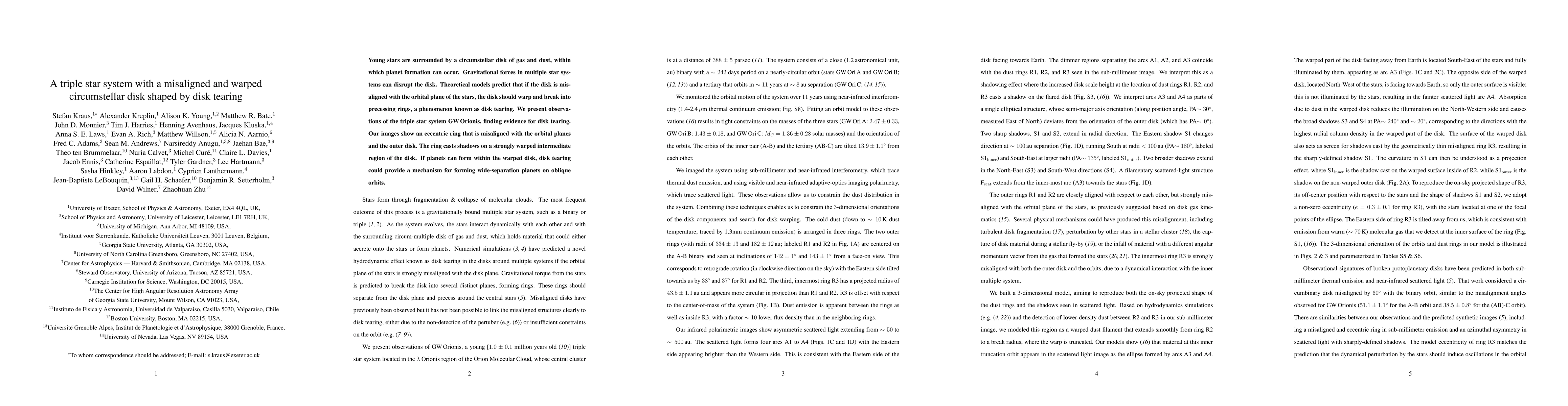 This paper reports observations of the triple star system GW Orionis, revealing evidence of disk tearing where a misaligned and warped circumstellar disk forms eccentric rings due to gravitational disruption. The findings suggest that disk tearing could facilitate the formation of wide-separation planets on oblique orbits.