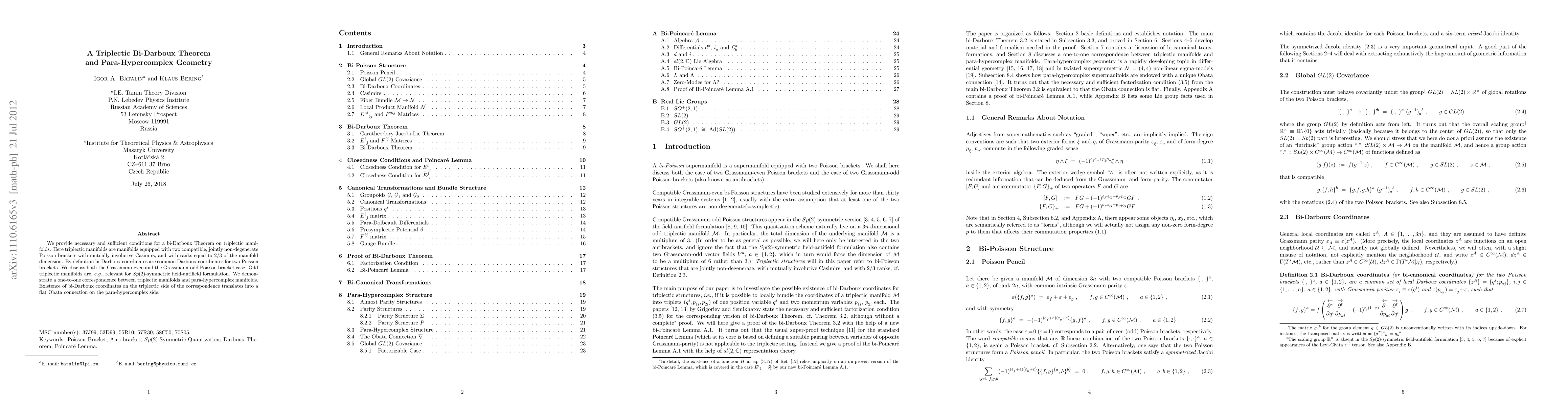 We provide necessary and sufficient conditions for a bi-Darboux Theorem on triplectic manifolds. Here triplectic manifolds are manifolds equipped with two compatible, jointly non-degenerate Poisson brackets with mutually involutive Casimirs, and with ranks equal to 2/3 of the manifold dimension. By definition bi-Darboux coordinates are common Darboux coordinates for two Poisson brackets. We discuss both the Grassmann-even and the Grassmann-odd Poisson bracket case. Odd triplectic manifolds are, e.g., relevant for Sp(2)-symmetric field-antifield formulation. We demonstrate a one-to-one correspondence between triplectic manifolds and para-hypercomplex manifolds. Existence of bi-Darboux coordinates on the triplectic side of the correspondence translates into a flat Obata connection on the para-hypercomplex side.