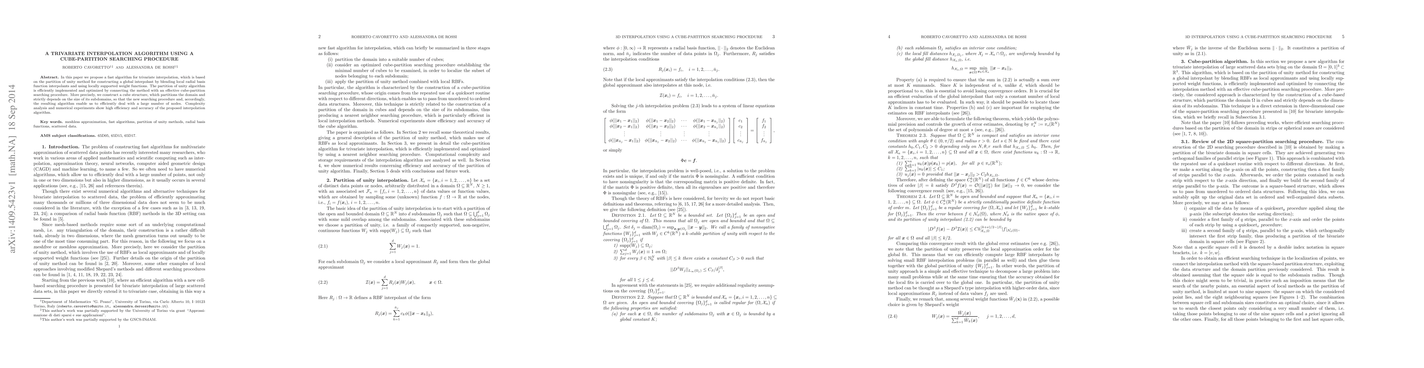 In this paper we propose a fast algorithm for trivariate interpolation, which is based on the partition of unity method for constructing a global interpolant by blending local radial basis function interpolants and using locally supported weight functions. The partition of unity algorithm is efficiently implemented and optimized by connecting the method with an effective cube-partition searching procedure. More precisely, we construct a cube structure, which partitions the domain and strictly depends on the size of its subdomains, so that the new searching procedure and, accordingly, the resulting algorithm enable us to efficiently deal with a large number of nodes. Complexity analysis and numerical experiments show high efficiency and accuracy of the proposed interpolation algorithm.