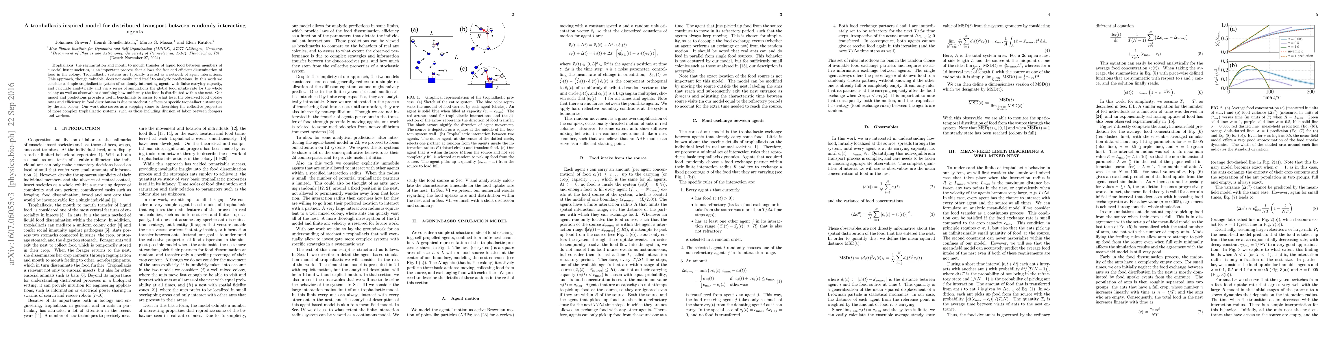 A trophallaxis inspired model for distributed transport between randomly interacting agents Trophallaxis, the regurgitation and mouth to mouth transfer of liquid food between members of eusocial insect societies, is an important process that allows the fast and efficient dissemination of food in the colony. Trophallactic systems are typically treated as a network of agent interactions. This approach, though valuable, does not easily lend itself to analytic predictions. In this work we consider a simple trophallactic system of randomly interacting agents with finite carrying capacity, and calculate analytically and via a series of simulations the global food intake rate for the whole colony as well as observables describing how uniformly the food is distributed within the nest. Our work serves as a stepping stone to describing the collective properties of more complex trophallactic systems, such as those including division of labor between foragers and workers.