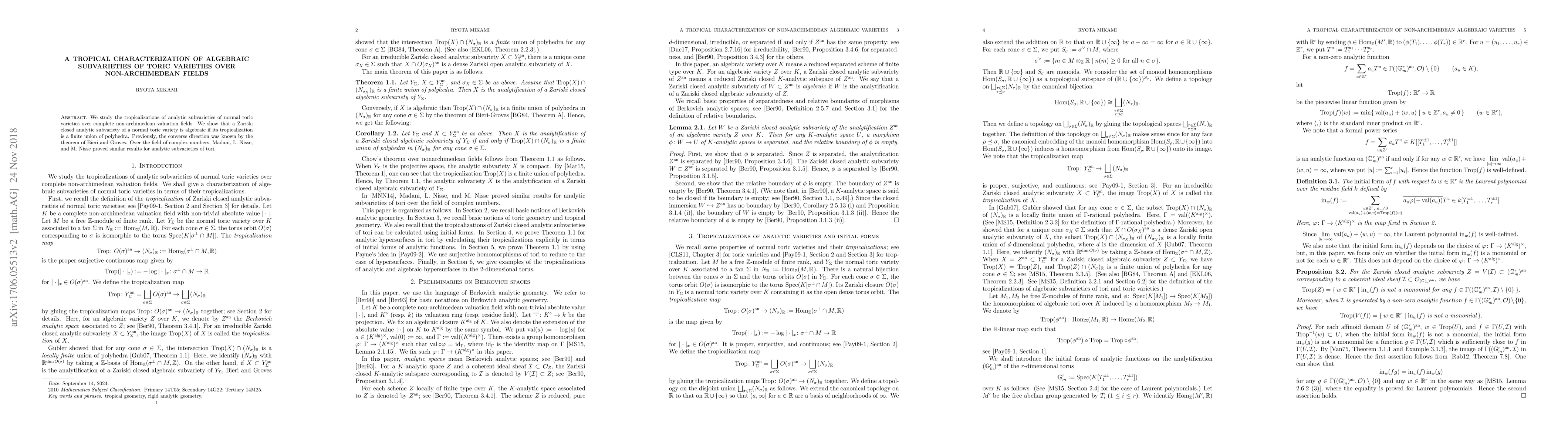 Summary: This paper explores the tropicalizations of analytic subvarieties in normal toric varieties over complete non-archimedean fields, proving that such subvarieties are algebraic if their tropicalizations are finite unions of polyhedra, complementing a previously known converse result. Analogous results for tori were previously established over the complex numbers.