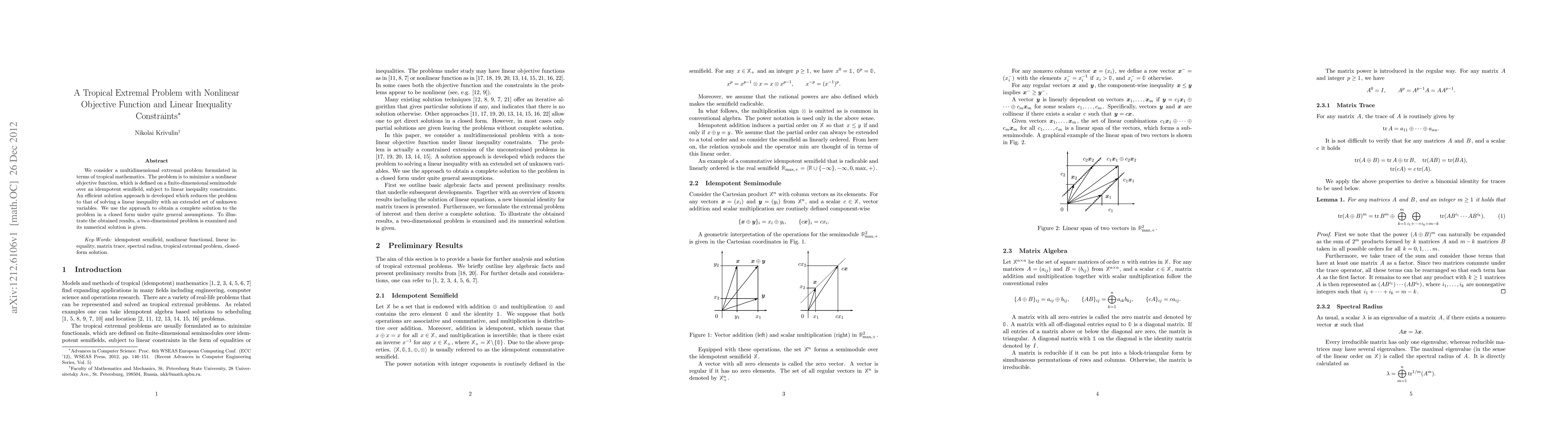 Researchers develop an efficient solution approach to minimize a nonlinear objective function with linear inequality constraints in tropical mathematics, leading to a closed-form solution.