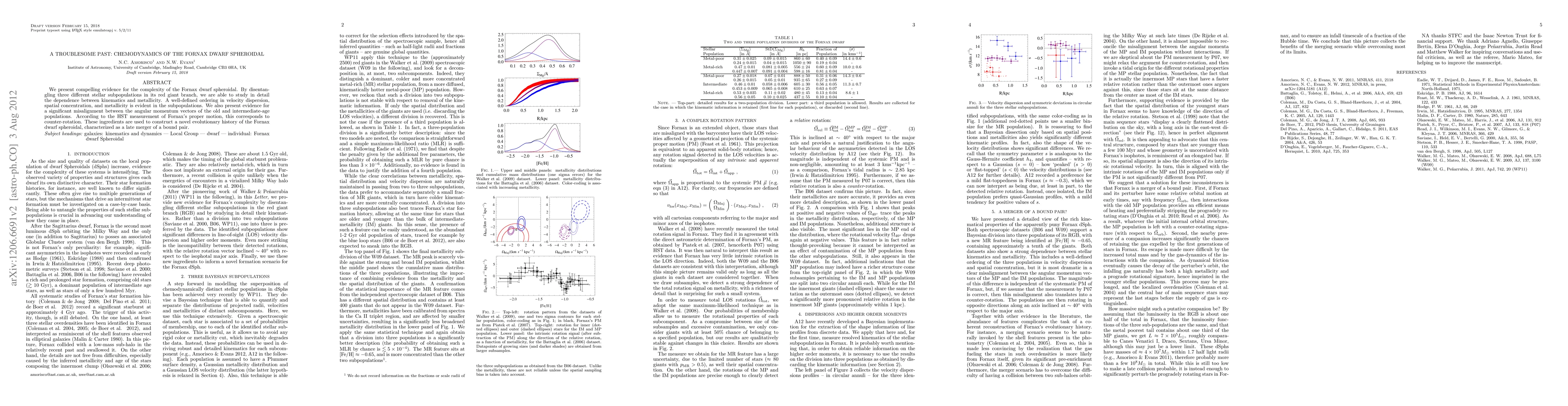 This paper investigates the complex chemodynamics of the Fornax dwarf spheroidal, revealing distinct stellar subpopulations with varying kinematics, spatial concentration, and metallicity. It presents evidence of counter-rotation between old and intermediate-age populations, leading to a proposed evolutionary history involving a late merger of a bound pair.