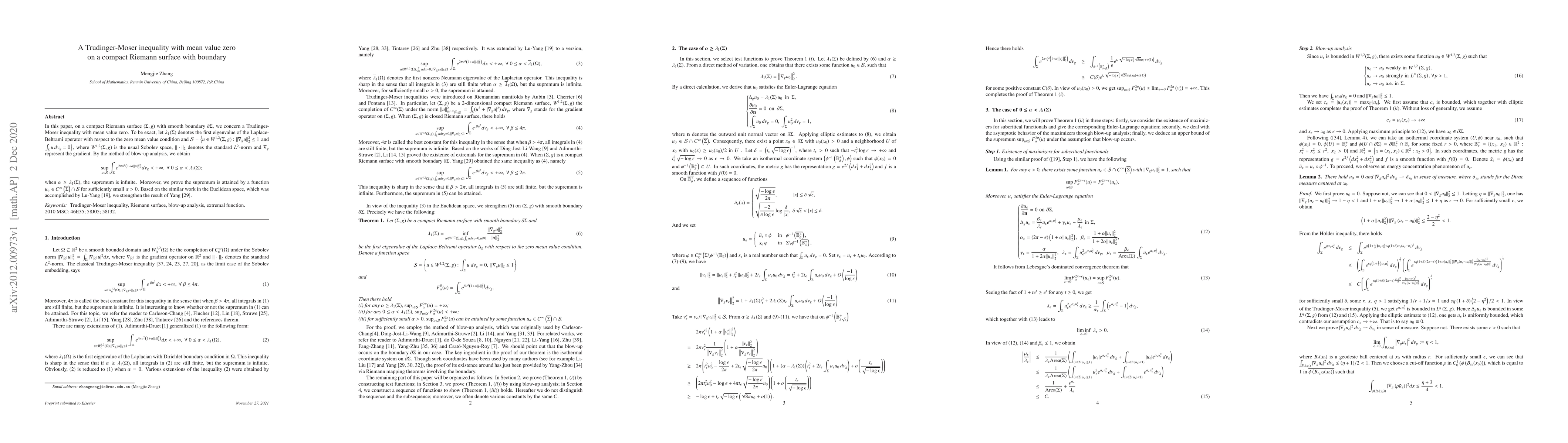 In this paper, on a compact Riemann surface $(\Sigma, g)$ with smooth boundary $\partial\Sigma$, we concern a Trudinger-Moser inequality with mean value zero. To be exact, let $\lambda_1(\Sigma)$ denotes the first eigenvalue of the Laplace-Beltrami operator with respect to the zero mean value condition and $\mathcal{ S }= \left\{ u \in W^{1,2} (\Sigma, g) : \|\nabla_g u\|_2^2 \leq 1\right.$ and $\left.\int_\Sigma u \,dv_g = 0 \right \},$ where $W^{1,2}(\Sigma, g)$ is the usual Sobolev space, $\|\cdot\|_2$ denotes the standard $L^2$-norm and $\nabla_{g}$ represent the gradient. By the method of blow-up analysis, we obtain \begin{eqnarray*} \sup_{u \in \mathcal{S}} \int_{\Sigma} e^{ 2\pi u^{2} \left(1+\alpha\|u\|_2^{2}\right) }d v_{g} <+\infty, \ \forall \ 0 \leq\alpha<\lambda_1(\Sigma); \end{eqnarray*} when $\alpha \geq\lambda_1(\Sigma)$, the supremum is infinite. Moreover, we prove the supremum is attained by a function $u_{\alpha} \in C^\infty\left(\overline{\Sigma}\right)\cap \mathcal {S}$ for sufficiently small $\alpha> 0$. Based on the similar work in the Euclidean space, which was accomplished by Lu-Yang \cite{Lu-Yang}, we strengthen the result of Yang \cite{Yang2006IJM}.