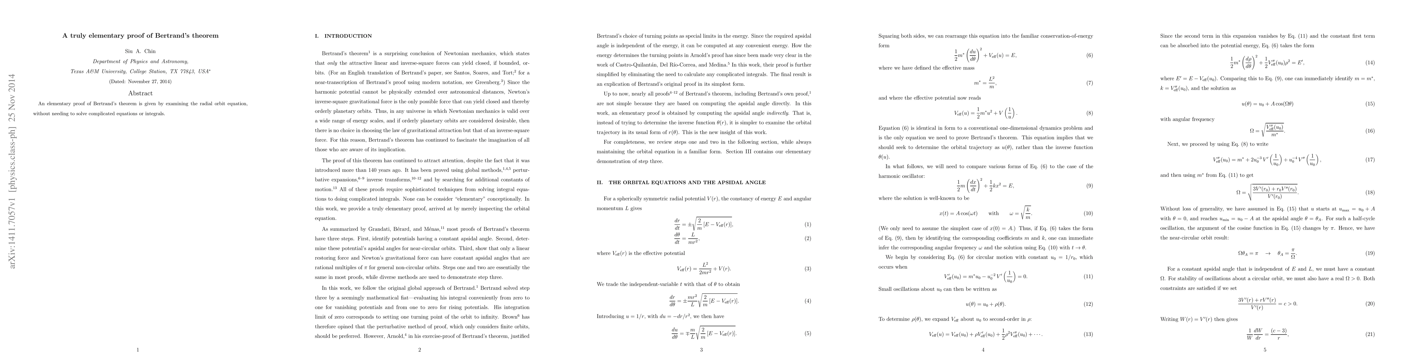 An elementary proof of Bertrand's theorem is given by examining the radial orbit equation, without needing to solve complicated equations or integrals.
