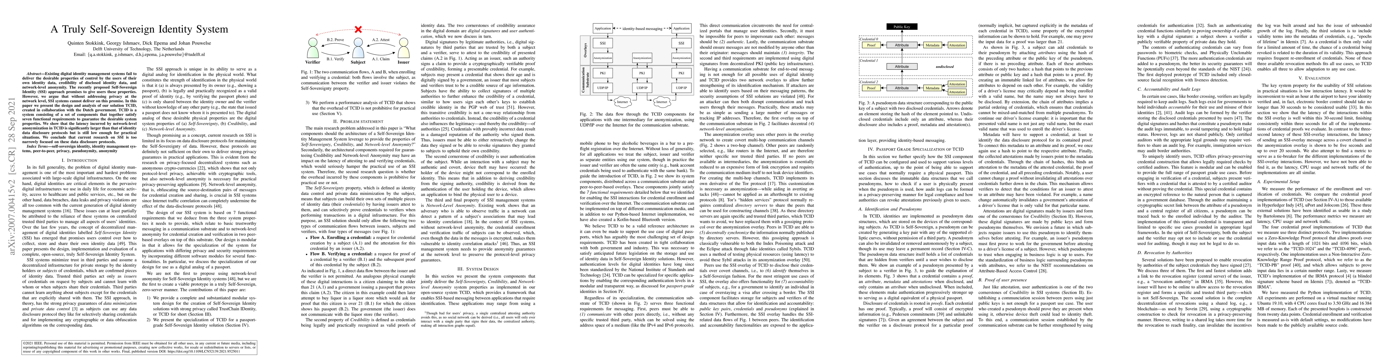 Existing digital identity management systems fail to deliver the desirable properties of control by the users of their own identity data, credibility of disclosed identity data, and network-level anonymity. The recently proposed Self-Sovereign Identity (SSI) approach promises to give users these properties. However, we argue that without addressing privacy at the network level, SSI systems cannot deliver on this promise. In this paper we present the design and analysis of our solution TCID, created in collaboration with the Dutch government. TCID is a system consisting of a set of components that together satisfy seven functional requirements to guarantee the desirable system properties. We show that the latency incurred by network-level anonymization in TCID is significantly larger than that of identity data disclosure protocols but is still low enough for practical situations. We conclude that current research on SSI is too narrowly focused on these data disclosure protocols.