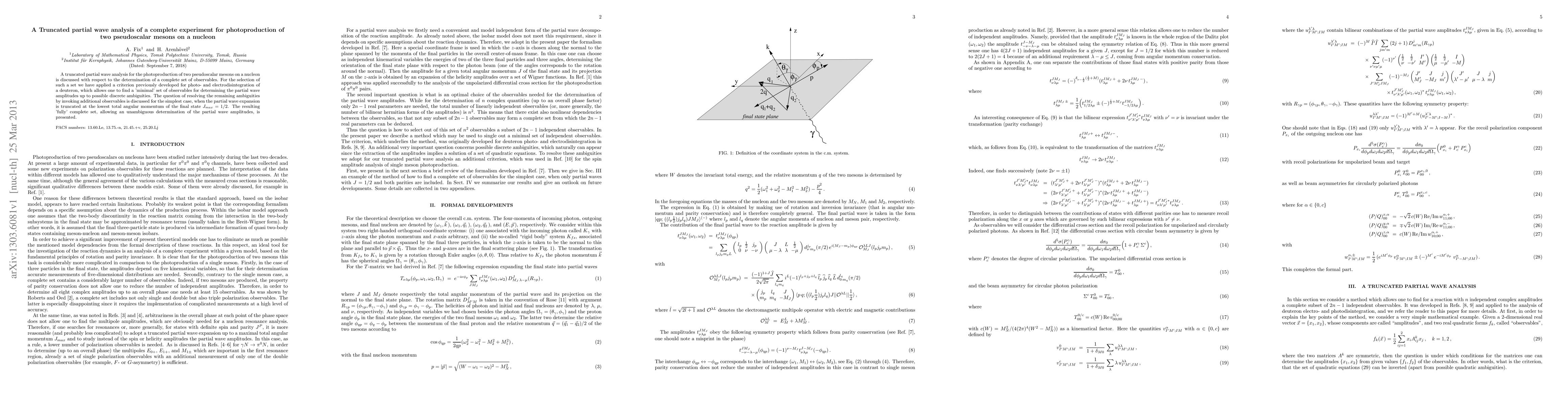 This paper presents a truncated partial wave analysis for photoproduction of two pseudoscalar mesons on a nucleon, focusing on determining a minimal set of observables to resolve partial wave amplitudes. The method extends a previously developed criterion for deuteron disintegration, aiming to resolve ambiguities in the simplest case where the expansion is truncated at $J_{max}=1/2$.