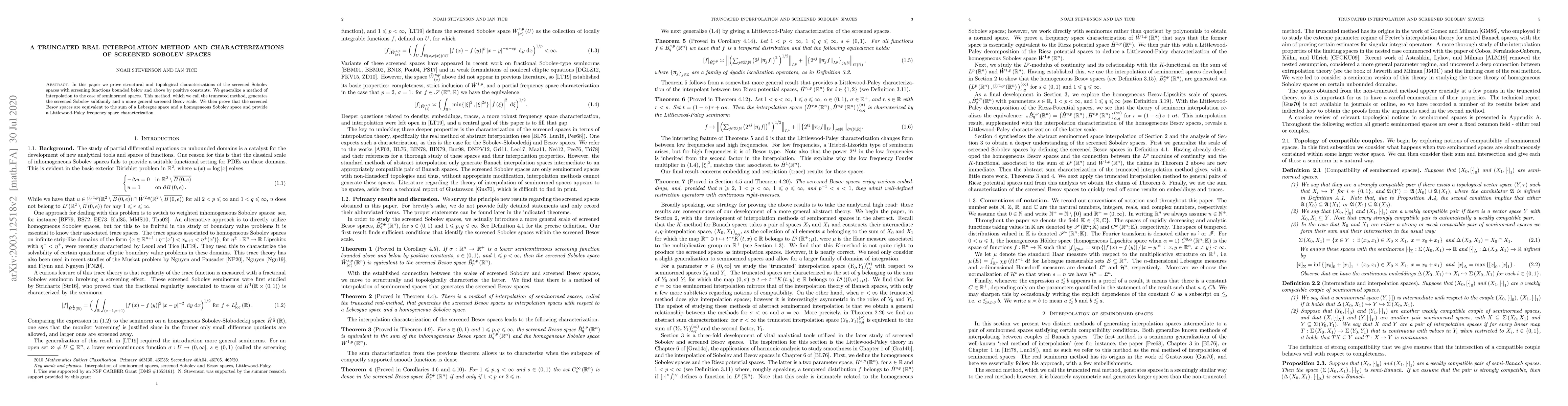 This research paper presents a truncated real interpolation method, characterizing screened Sobolev spaces with bounded screening functions. It extends this method to seminormed spaces, generating a screened Sobolev subfamily and a broader screened Besov scale. The study concludes with proofs that screened Besov spaces equate to Lebesgue plus homogeneous Sobolev spaces, offering a Littlewood-Paley frequency space characterization.
