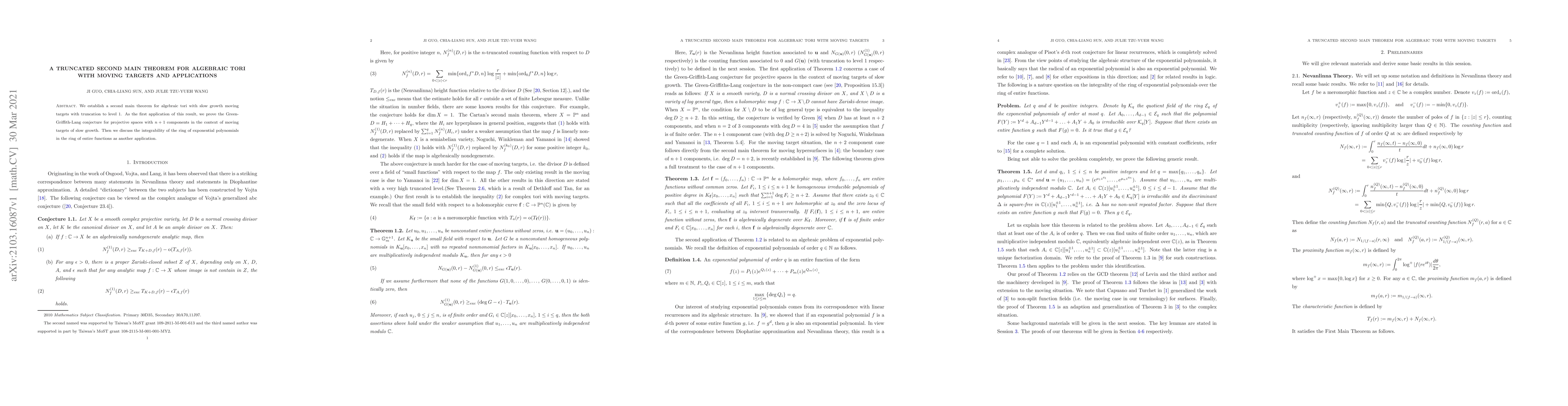 This paper establishes a truncated second main theorem for algebraic tori with slowly growing moving targets, and applies it to prove the Green-Griffith-Lang conjecture for projective spaces with $n+1$ components and discusses the integrability of exponential polynomials in entire functions.
