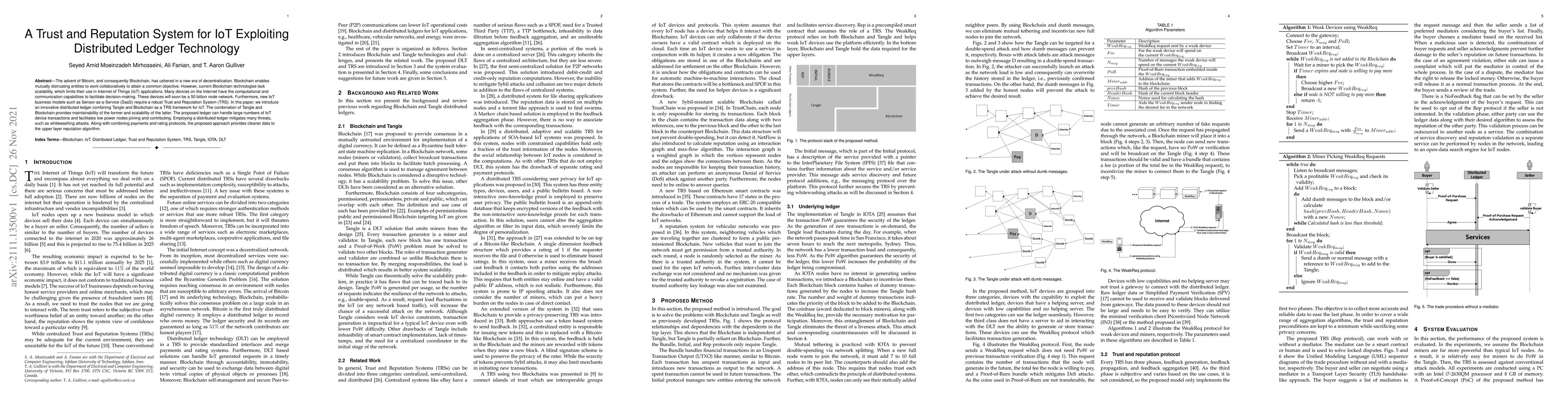 The advent of Bitcoin, and consequently Blockchain, has ushered in a new era of decentralization. Blockchain enables mutually distrusting entities to work collaboratively to attain a common objective. However, current Blockchain technologies lack scalability, which limits their use in Internet of Things (IoT) applications. Many devices on the Internet have the computational and communication capabilities to facilitate decision-making. These devices will soon be a 50 billion node network. Furthermore, new IoT business models such as Sensor-as-a-Service (SaaS) require a robust Trust and Reputation System (TRS). In this paper, we introduce an innovative distributed ledger combining Tangle and Blockchain as a TRS framework for IoT. The combination of Tangle and Blockchain provides maintainability of the former and scalability of the latter. The proposed ledger can handle large numbers of IoT device transactions and facilitates low power nodes joining and contributing. Employing a distributed ledger mitigates many threats, such as whitewashing attacks. Along with combining payments and rating protocols, the proposed approach provides cleaner data to the upper layer reputation algorithm.